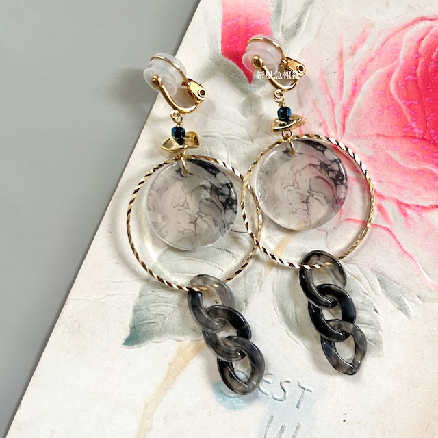 イベント参加中、前後は発送スケジュールに遅延がある場合がございます こちらのお知らせをご確認の上、ご注文ください https://shinse.thebase.in/items/52641316 「さみしいなにかをかく」は、診断メーカーから毎日ランダムに排出されるお題に添って作られた、言葉から産まれるすこし不思議なアクセサリーです。 お題のフレーズと、アクセサリー、そして短い文章によって完結します。 毎日日替わりの一点ものアクセサリーです。再入荷はなし。 一期一会の出会いをお楽しみください。 新星急報社さんは七夕の三日前、曲がり角にある煙草屋の前で踏まれた跡のある写真を拾った話をしてください。 #さみしいなにかをかく #shindanmaker https://shindanmaker.com/595943 「何の気なしに、ゴミだと思って拾った。煙草屋の横に屑籠があるのは知っていたから、そこに放り込んだらいいと。この季節特有のあまりにもいい夕べの風に背を押されて、すこしの善行をするような気持ちで。拾ってみて、それが写真で、なぜか、見たことがあるような気がする景色が映っていることに気がついた。褪せた風景は、もうこの世のどこにもないのに。」 墨流しのような模様がプリントされたシェルパーツを 折れた写真に見立てて 煙のように揺れるプラスチックのチェーンをリングに直接留め付け 浮遊感を演出しました ボリュームと、クールな印象が両立したイヤリングです。 ●使用部材 ガラス(チェコ製、オーストリア製)、人工合成樹脂 金属素材:メッキ(ゴールド色) 一般的にアクセサリーに使用されるものです。 イヤリング部 シルバー925/k18めっき 日本製の痛みがでにくいパーツを使用しています。 イヤリングの詳細はこちらでご確認くださいませ https://shinse.thebase.in/blog/2025/10/01/215740 ※写真と実物の色味に誤差がある場合がございますので、すべての写真をご確認の上予めご了承ください。 ※写真の小道具は販売品には含まれません、アクセサリーのみをお届けします。 ●このイヤリングはピアス金具へ交換可能です 以下のテンプレートをコピーし、【備考欄】に書き込んでください。 ------------- ピアス金具へ交換希望 ・レバーバックタイプしずく型 ・レバーバックタイプ丸型 ・スタッドタイプ (※ご希望のものを残し、二つを消してください) ------------- ピアス金具詳細説明は以下記事をご覧ください。 https://shinse.thebase.in/blog/2020/07/05/181529 メッキにより金具の開閉が固い場合がございますがご了承くださいませ。 ●チェーン長さ調整 対応不可 ●お送り時の梱包 基本の梱包についてはこちらをご参照ください。 https://shinse.thebase.in/blog/2020/09/09/200253 有料ラッピングも承っておりますのでご検討ください。 シャーレ・https://shinse.thebase.in/items/33611818 ボックス・https://shinse.thebase.in/items/33611845 ご了承ください ●お取り扱い上のご注意 着用時、体質によっては皮膚にかゆみ、かぶれなどの症状が出る場合がございます。 異常を感じた際は直ちに着用を中止し、医療機関へご相談ください。 細かいパーツ、合金素材などを含みます。 乳幼児や愛玩動物の手の届かないところでご着用、保管してください。 水分や汗などはアクセサリーの変色や破損の原因となり さらに自他へ危害を加える可能性がございます。 運動時や家事、入浴などにあたっては着用をお避けになることをおすすめいたします。 またご使用後はやわらかい布などで拭いてから、 直射日光が当たらないところでの保管をおすすめいたします。 また毎日の使用はお勧めしておりません。 詳細はこちらをご一読ください。 https://shinse.thebase.in/blog/2020/09/01/220712 修理につきましては下記条件にてお受けいたします。 新星急報社のアクセサリーはすべて同様の条件で修理します。 https://shinse.thebase.in/blog/2020/09/01/222552 デザインの都合上磨かれていないものや 内外に瑕のある天然素材などを使用している場合がございます。 また、ヴィンテージのパーツなどを使っている場合、 経年劣化や表面に擦れなどがある場合がございます。 フローライト、アパタイトなどは特に脆く、 衝撃で割れやすい石となっております。 またワイヤーなどを使い手作業で構成しており 工業製品ほどの堅牢さはございません。 気になる方はご購入をお控えください。 染色された素材は濡れた状態で使用する、 強い圧力をかけるなどされますと衣服に色移りする可能性がございます。 お取り扱いにはご注意ください。 検索用: 金 黒 白 灰 偏光