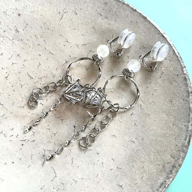 イベント参加中、前後は発送スケジュールに遅延がある場合がございます こちらのお知らせをご確認の上、ご注文ください https://shinse.thebase.in/items/52641316 「さみしいなにかをかく」は、診断メーカーから毎日ランダムに排出されるお題に添って作られた、言葉から産まれるすこし不思議なアクセサリーです。 お題のフレーズと、アクセサリー、そして短い文章によって完結します。 毎日日替わりの一点ものアクセサリーです。再入荷はなし。 一期一会の出会いをお楽しみください。 新星急報社さんは雨が降ったので水やりをさぼった日、カーテンの閉じた長距離バスの中で昔のことを思い出した話をしてください。 #さみしいなにかをかく #shindanmaker https://shindanmaker.com/595943 「カーテンの隙間の向こうは、後ろに飛んでいく街灯ばかり。ささやかな雨が、窓ガラスにあたって、斜め横の線になって伸びていった。こんな景色を、昔どこかで見た。知っている。旅の間に見えるもの。」 ムーンストーンにつなげたリングに ぶら下げたチェーンと、 キュービックジルコニア入りのダイヤ型チャームが ゆらゆら揺れて、 雨や旅のようなイメージで。 ●使用部材 ムーンストーン、キュービックジルコニア 金属素材:メッキ(シルバー色) 一般的にアクセサリーに使用されるものです。 イヤリング部 シルバー925/ロジウムめっき 日本製の痛みがでにくいパーツを使用しています。 ※写真と実物の色味に誤差がある場合がございますので、すべての写真をご確認の上予めご了承ください。 ※写真の小道具は販売品には含まれません、アクセサリーのみをお届けします。 ●このイヤリングはピアス金具へ交換可能です 以下のテンプレートをコピーし、【備考欄】に書き込んでください。 ------------- ピアス金具へ交換希望 ・レバーバックタイプしずく型 ・レバーバックタイプ丸型 ・スタッドタイプ (※ご希望のものを残し、二つを消してください) ------------- ピアス金具詳細説明は以下記事をご覧ください。 https://shinse.thebase.in/blog/2020/07/05/181529 メッキにより金具の開閉が固い場合がございますがご了承くださいませ。 ●チェーン長さ調整【有料】 現在モチーフ部6センチ チェーンのカットのみ対応可能 -1.5センチまで調整できます デザインがかなり変わりますがご了承ください くわしくはこちら https://shinse.thebase.in/items/6260548 ●お送り時の梱包 基本の梱包についてはこちらをご参照ください。 https://shinse.thebase.in/blog/2020/09/09/200253 有料ラッピングも承っておりますのでご検討ください。 シャーレ・https://shinse.thebase.in/items/33611818 ボックス・https://shinse.thebase.in/items/33611845 ●お取り扱い上のご注意 着用時、体質によっては皮膚にかゆみ、かぶれなどの症状が出る場合がございます。 異常を感じた際は直ちに着用を中止し、医療機関へご相談ください。 細かいパーツ、合金素材などを含みます。 乳幼児や愛玩動物の手の届かないところでご着用、保管してください。 水分や汗などはアクセサリーの変色や破損の原因となり さらに自他へ危害を加える可能性がございます。 運動時や家事、入浴などにあたっては着用をお避けになることをおすすめいたします。 またご使用後はやわらかい布などで拭いてから、 直射日光が当たらないところでの保管をおすすめいたします。 また毎日の使用はお勧めしておりません。 詳細はこちらをご一読ください。 https://shinse.thebase.in/blog/2020/09/01/220712 修理につきましては下記条件にてお受けいたします。 新星急報社のアクセサリーはすべて同様の条件で修理します。 https://shinse.thebase.in/blog/2020/09/01/222552 デザインの都合上磨かれていないものや 内外に瑕のある天然素材などを使用している場合がございます。 また、ヴィンテージのパーツなどを使っている場合、 経年劣化や表面に擦れなどがある場合がございます。 フローライト、アパタイトなどは特に脆く、 衝撃で割れやすい石となっております。 またワイヤーなどを使い手作業で構成しており 工業製品ほどの堅牢さはございません。 気になる方はご購入をお控えください。 染色された素材は濡れた状態で使用する、 強い圧力をかけるなどされますと衣服に色移りする可能性がございます。 お取り扱いにはご注意ください。 検索用: 銀 クリア 白