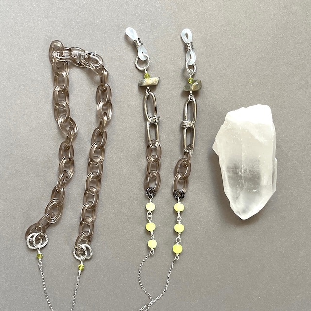 イベント参加中、前後は発送スケジュールに遅延がある場合がございます こちらのお知らせをご確認の上、ご注文ください https://shinse.thebase.in/items/52641316 「さみしいなにかをかく」は、診断メーカーから毎日ランダムに排出されるお題に添って作られた、言葉から産まれるすこし不思議なアクセサリーです。 お題のフレーズと、アクセサリー、そして短い文章によって完結します。 毎日日替わりの一点ものアクセサリーです。再入荷はなし。 一期一会の出会いをお楽しみください。 新星急報社さんは屋根を雨が叩く昼過ぎ、いつもテレビがつきっぱなしの部屋で思い通りの夢を見る方法の話をしてください。 #さみしいなにかをかく #shindanmaker https://shindanmaker.com/595943 「テレビから聞こえる声が、雨音と混じって、意味の取れないノイズになっていく。すべてがぼんやりと輪郭を失って、身体から力が抜けていく。目をつむる。もう見られないはずの砂嵐が瞼の裏にやってくるだろう。言葉になる前の、名前をまだ持たないヴィジョンがやがて訪れる。」 ラフなラブラドライトに ねじれたメタルパーツ、プラスチックチェーン 蛍光のビーズがアクセント、砂嵐の残像のような印象に仕立てました ●使用部材 合成樹脂樹脂、ガラス その他金属素材:メッキ(シルバー色) 一般的にアクセサリーに使用されるものです。 ※写真と実物の色味に誤差がある場合がございますので すべての写真をご確認の上予めご了承ください。 ※写真の小道具は販売品には含まれません、アクセサリーのみをお届けします。 ●全体長さ 全体 約74センチ ●チェーン長さ調整【有料】 背面プラスチックチェーン部、金属チェーン部(細い個所のみ) ご希望長さで仕上げ可能(カットのみ) https://shinse.thebase.in/categories/525696 有償のサービスとなりますので上記URLをご参照ください。 これ以上の調整が必要な場合はお問い合わせください ●取付金具 メガネへ取り付ける金具部分は半透明白・不透明黒を ご用意しております。 こちらのアクセサリーは白をご用意しております。 黒へ変更をご希望の場合は備考へお書き添え下さい。 この変更は無償で行います。 ●お取り扱い上のご注意 新星急報社のグラスコードは眼鏡やサングラスをデコレーションするものであり 眼鏡やサングラスを支えるものとしてはおすすめしておりません。 当方のグラスコード使用時の眼鏡類の落下や破損などにつきましては 責任を負うことができませんのでご了承ください。 眼鏡へ取り付ける部分はやわらかいゴム素材を使用しております。 強い力を加えたり、無理にひっぱったりすることは 破損の原因になりますのでご注意ください。 なお、該当部分が破損した場合は往復送料+100円にて 新しいパーツへのお取り換えをいたします。 保証書記載のメールアドレスへお知らせください。 着用時、体質によっては皮膚にかゆみ、かぶれなどの症状が出る場合がございます。 異常を感じた際は直ちに着用を中止し、医療機関へご相談ください。 細かいパーツ、合金素材などを含みます。 乳幼児や愛玩動物の手の届かないところでご着用、保管してください。 水分や汗などはアクセサリーの変色や破損の原因となり さらに自他へ危害を加える可能性がございます。 運動時や家事、入浴などにあたっては着用をお避けになることをおすすめいたします。 またご使用後はやわらかい布などで拭いてから、 直射日光が当たらないところでの保管をおすすめいたします。 また毎日の使用はお勧めしておりません。 詳細はこちらをご一読ください。http://blog.shinsei.nu/?eid=1428258 デザインの都合上磨かれていないものや 内外に瑕のある天然素材などを使用している場合がございます。 フローライト、アパタイトなどは特に脆く、 衝撃で割れやすい石となっております。 またワイヤーなどを使い手作業で構成しており 工業製品ほどの堅牢さはございません。 染色された素材は濡れた状態で使用する、 強い圧力をかけるなどされますと衣服に色移りする可能性がございます。 お取り扱いにはご注意ください。 検索用: 銀 灰 蛍光 黄 緑