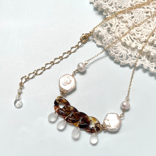 イベント参加中、前後は発送スケジュールに遅延がある場合がございます こちらのお知らせをご確認の上、ご注文ください https://shinse.thebase.in/items/52641316 「さみしいなにかをかく」は、診断メーカーから毎日ランダムに排出されるお題に添って作られた、言葉から産まれるすこし不思議なアクセサリーです。 お題のフレーズと、アクセサリー、そして短い文章によって完結します。 毎日日替わりの一点ものアクセサリーです。再入荷はなし。 一期一会の出会いをお楽しみください。 新星急報社さんは月下美人の花が咲く頃、隅々まで整えられた部屋でやけにきしむきみの髪に触れたことの話をしてください。 #さみしいなにかをかく #shindanmaker https://shindanmaker.com/595943 「まるで何もないように澄んだガラス窓から、明るい月の光が差し込んで床に斜めのラインを描いていた。かすかに、甘く、また青い香りが、静かに、漂うように香る。きみの髪の毛だけが、ほつれたように、捨てられた人形のように不釣り合いに見えた。今ここに生きているものなどなにもないような気がして。」 人工的で美しい光景の中に、 生や死の印象があるようにしたいと考えて 六角形の核を入れて養殖された真珠を使いました。 べっこう風のプラスチックチェーンには ひとくさりずつドロップを下げて 存在を強調するように。 プラスチックチェーンのふくらみに引っかかって ドロップの配置がずれることがございますが 優しくずらして調整してください ●使用部材 合成人工樹脂、ガラス(主にチェコ製)、淡水真珠 その他金属素材:メッキ(ゴールド色) 一般的にアクセサリーに使用されるものです。 ※写真と実物の色味に誤差がある場合がございますので、すべての写真をご確認の上予めご承ください。 ※写真の小道具は販売品には含まれません、アクセサリーのみをお届けします。 ●全体長さ 本体部:約49センチ アジャスターチェーン部:約7センチ ※トルソーは9号です。 ●チェーン長さ調整 本体細チェーン部のみご希望長さで仕上げ可能 (カット可能、+本体約20センチまで) デザインが若干変動いたしますのでご了承ください https://shinse.thebase.in/categories/525696 有償のサービスとなりますので上記URLをご参照ください。 これ以上の調整が必要な場合はお問い合わせください。 ●左利き仕様への変更 現在はカニカンを右手で持ち、背中のほうで留める形状です。 ご希望のある場合はカニカン・アジャスターの左右を変更し 左手で使いやすくすることが可能です。 備考欄でお知らせください。こちらの変更は無償で行います。 ●お送り時の梱包 基本の梱包についてはこちらをご参照ください。 https://shinse.thebase.in/blog/2020/09/09/200253 有料ラッピングも承っておりますのでご検討ください。 シャーレ・https://shinse.thebase.in/items/33611818 ボックス・https://shinse.thebase.in/items/33611845 ●お取り扱い上のご注意 着用時、体質によっては皮膚にかゆみ、かぶれなどの症状が出る場合がございます。 異常を感じた際は直ちに着用を中止し、医療機関へご相談ください。 細かいパーツ、合金素材などを含みます。 乳幼児や愛玩動物の手の届かないところでご着用、保管してください。 水分や汗などはアクセサリーの変色や破損の原因となり さらに自他へ危害を加える可能性がございます。 運動時や家事、入浴などにあたっては着用をお避けになることをおすすめいたします。 またご使用後はやわらかい布などで拭いてから、 直射日光が当たらないところでの保管をおすすめいたします。 また毎日の使用はお勧めしておりません。 詳細はこちらをご一読ください。 https://shinse.thebase.in/blog/2020/09/01/220712 修理につきましては下記条件にてお受けいたします。 新星急報社のアクセサリーはすべて同様の条件で修理します。 https://shinse.thebase.in/blog/2020/09/01/222552 デザインの都合上磨かれていないものや 内外に瑕のある天然素材などを使用している場合がございます。 また、ヴィンテージのパーツなどを使っている場合、 経年劣化や表面に擦れなどがある場合がございます。 フローライト、アパタイトなどは特に脆く、 衝撃で割れやすい石となっております。 またワイヤーなどを使い手作業で構成しており 工業製品ほどの堅牢さはございません。 気になる方はご購入をお控えください。 染色された素材は濡れた状態で使用する、 強い圧力をかけるなどされますと衣服に色移りする可能性がございます。 お取り扱いにはご注意ください。 検索用: 金 白 茶 クリア