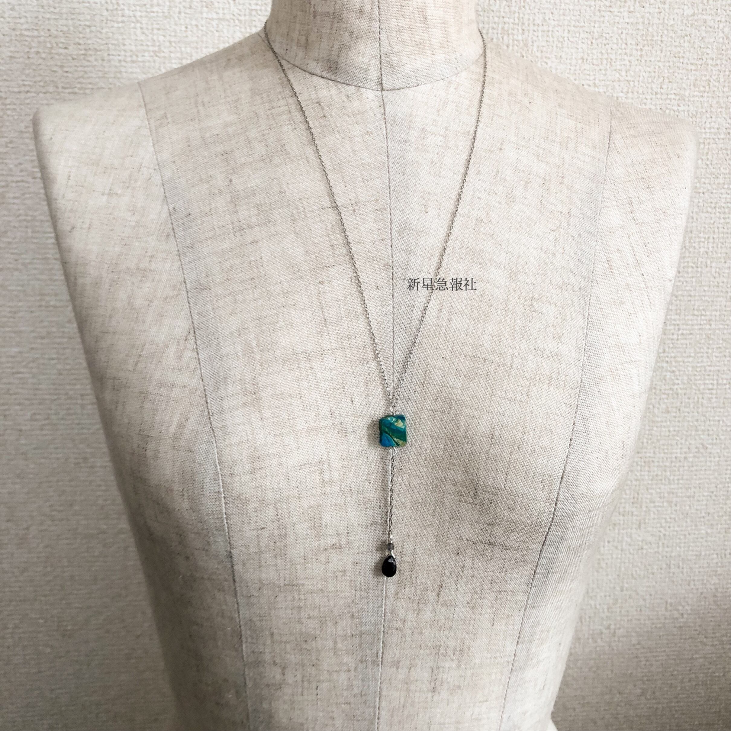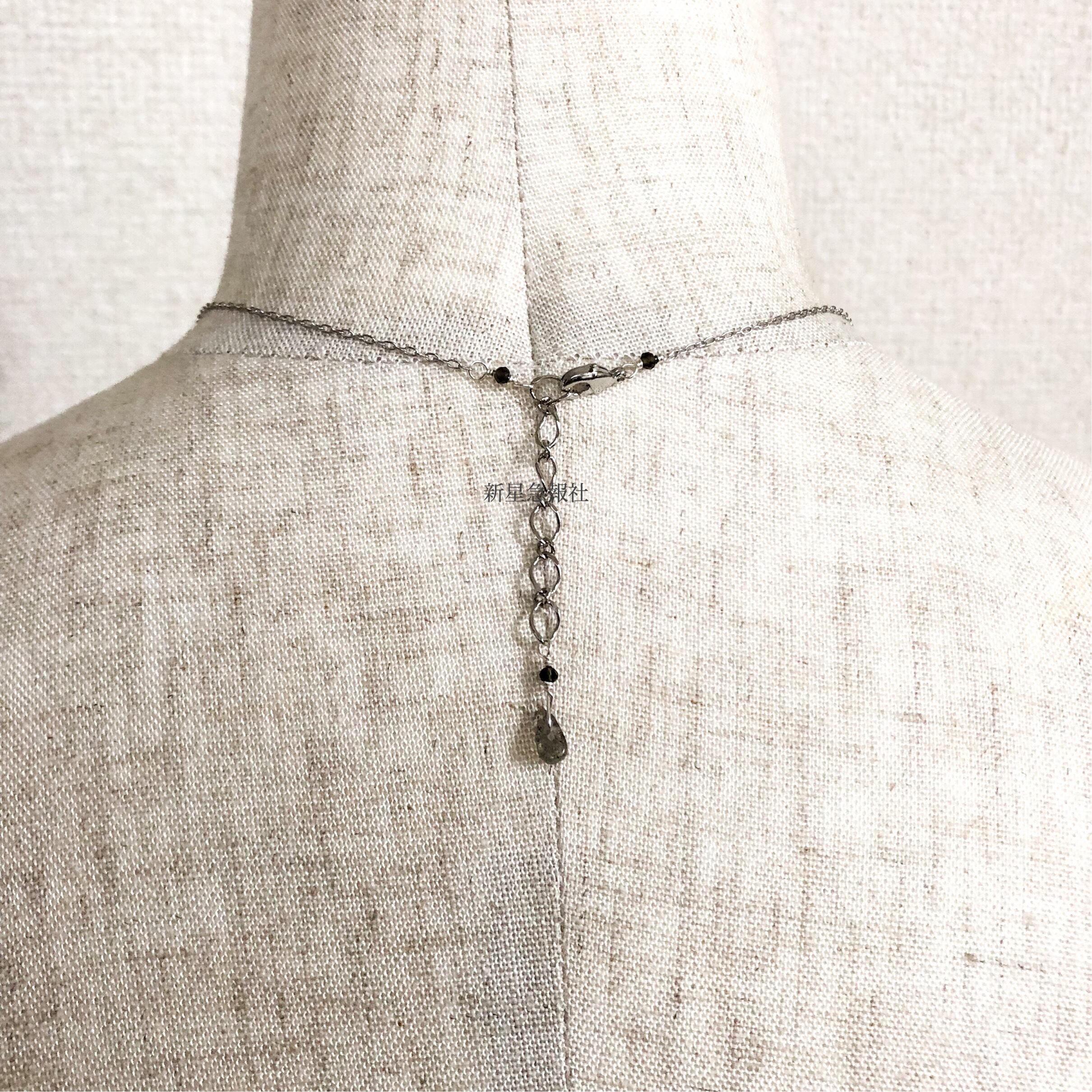 アクセサリーはブラックトルマリン、ブルーオパール、