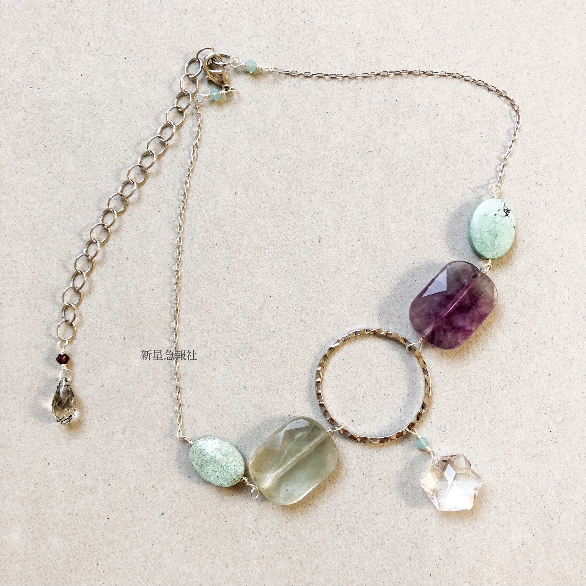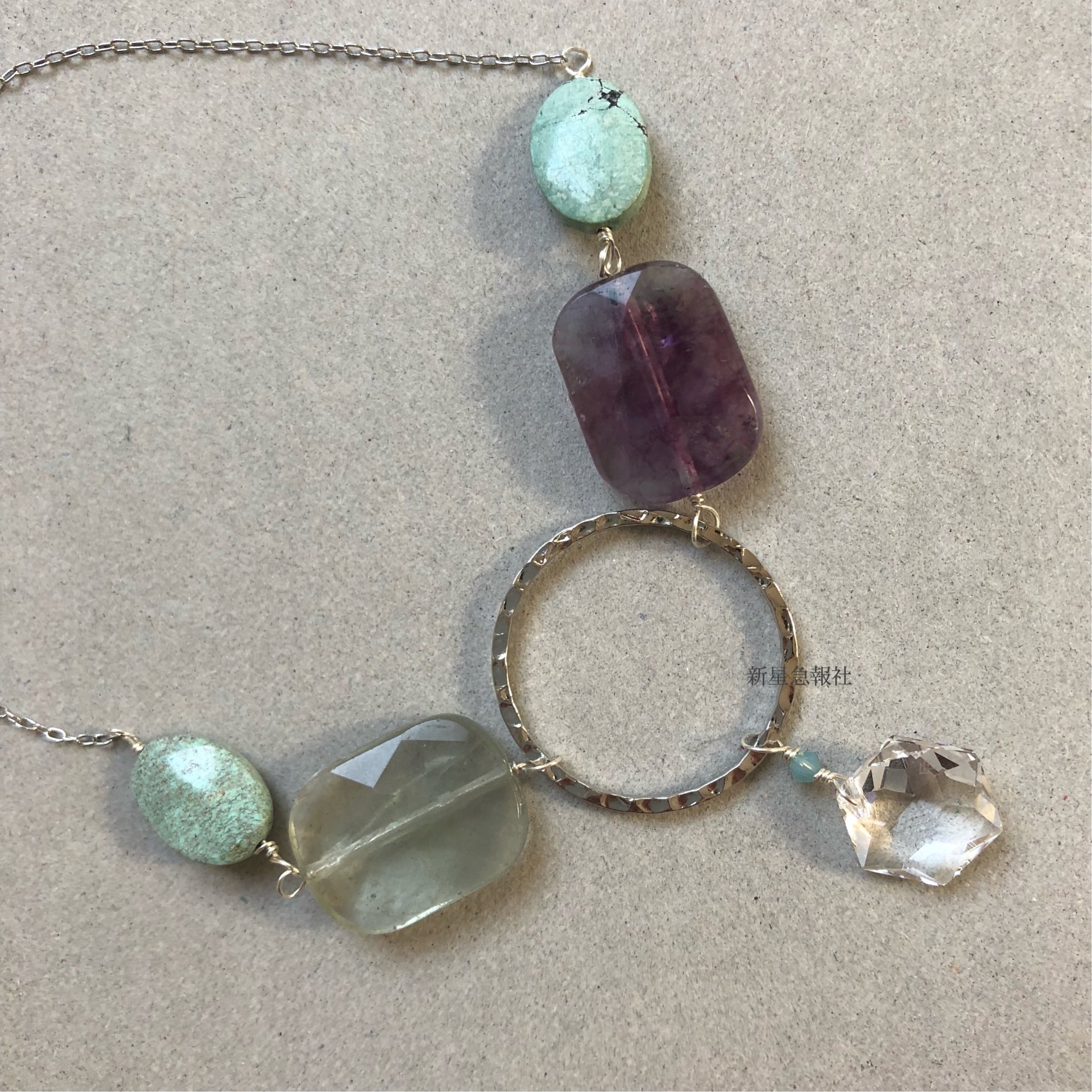 アクセサリーはフローライト、ターコイズ、ガラス(スワロフスキー社製)を含みます。