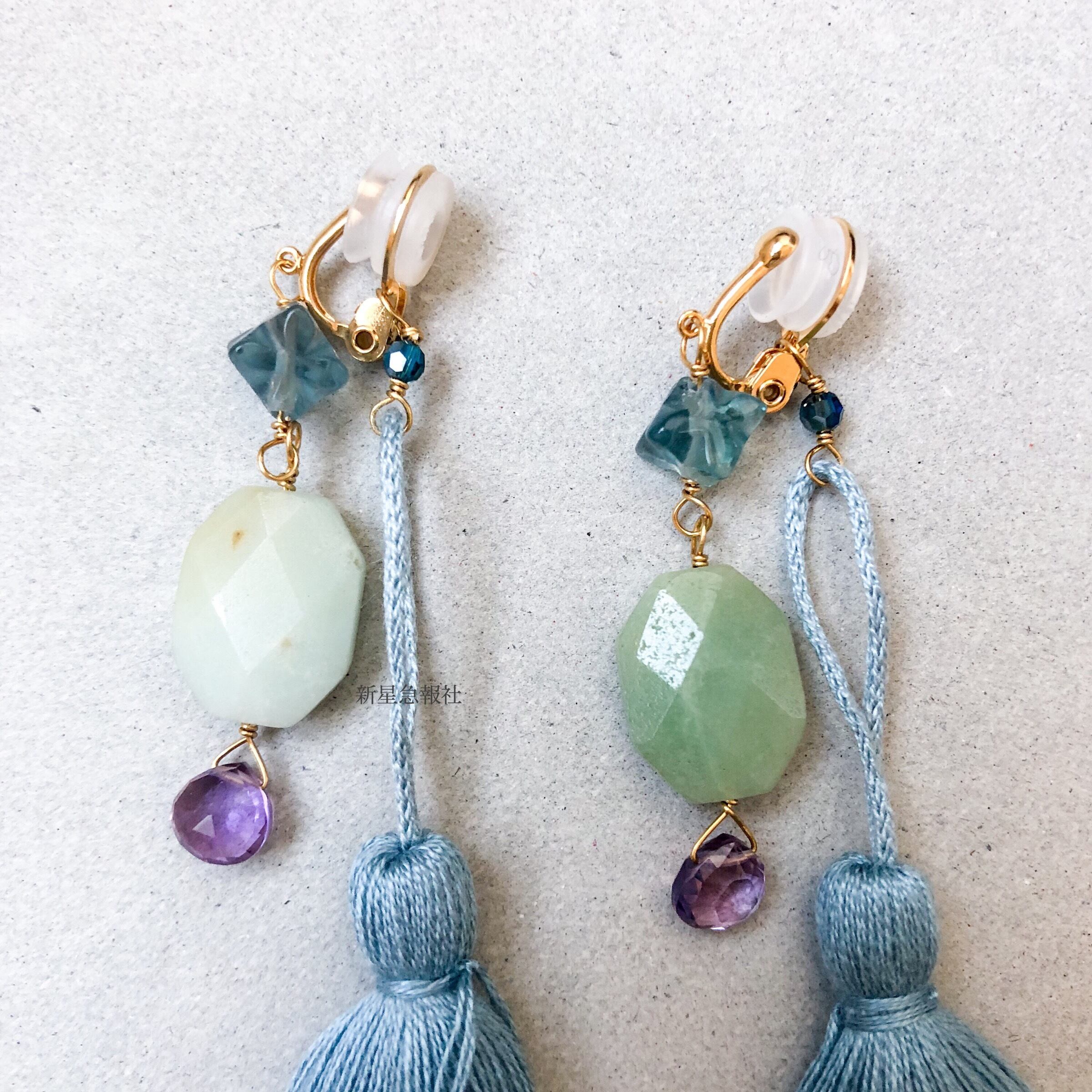 アクセサリーはアクリル、フローライト、アマゾナイト