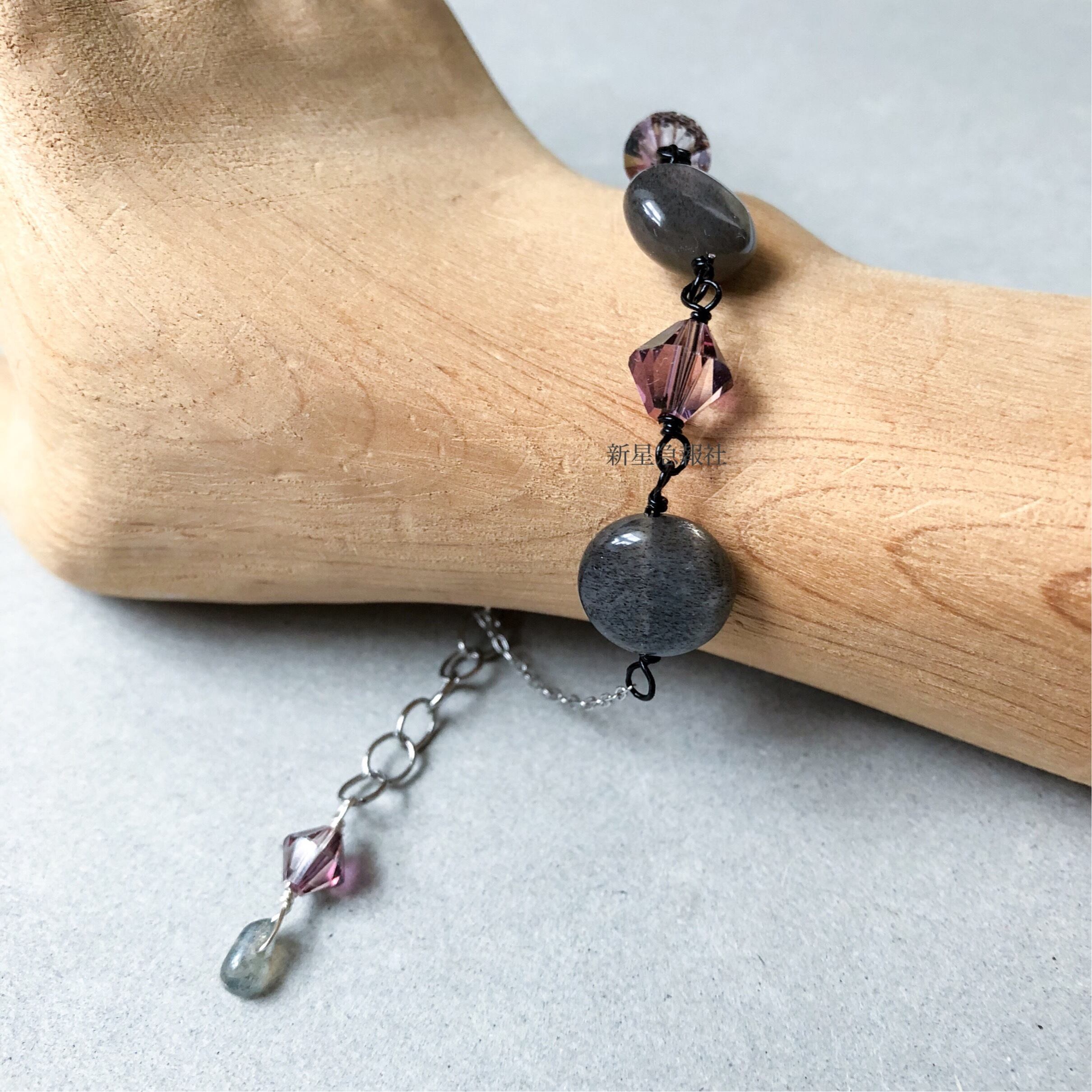 アクセサリーはグレームーンストーン、ラブラドライト、アイオライト