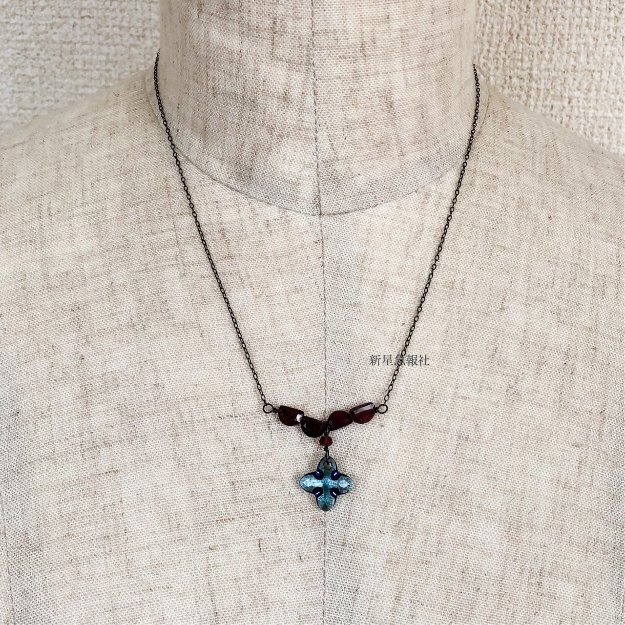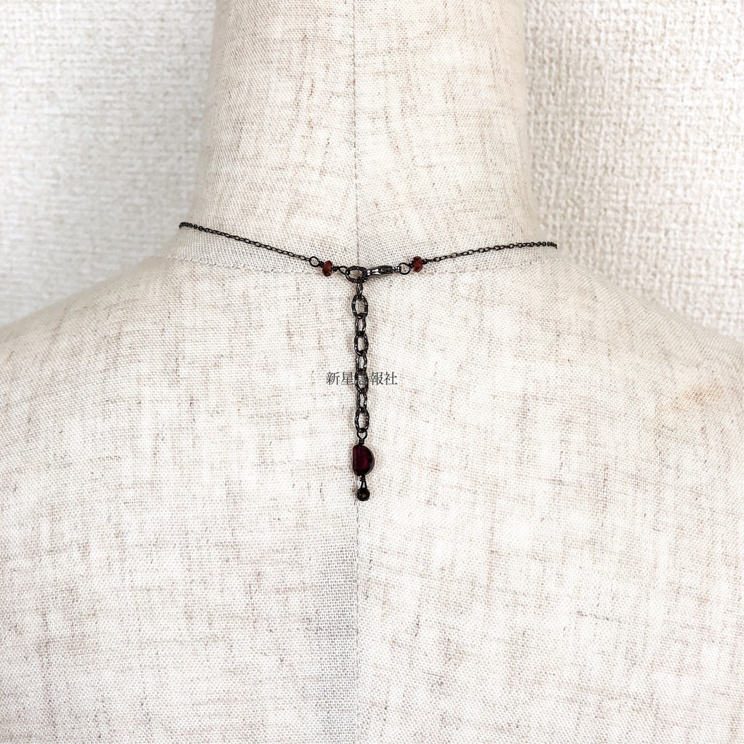 アクセサリーは黒曜石、ガーネット、ガラス(スワロフスキー社製のもの)を含みます。