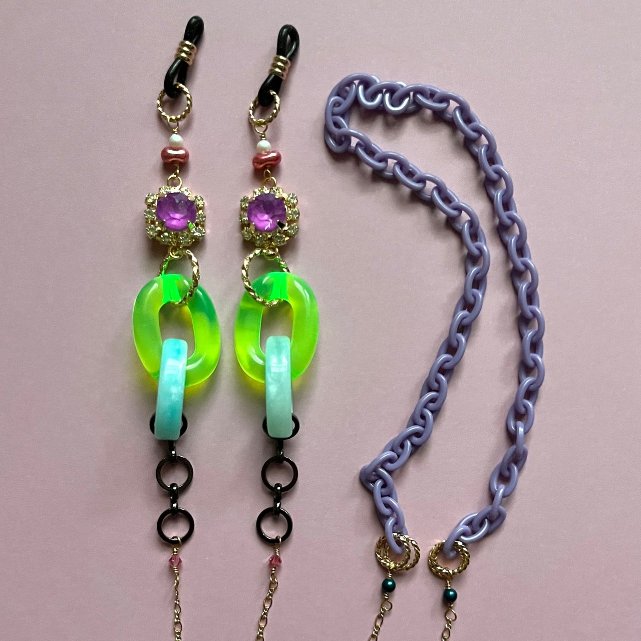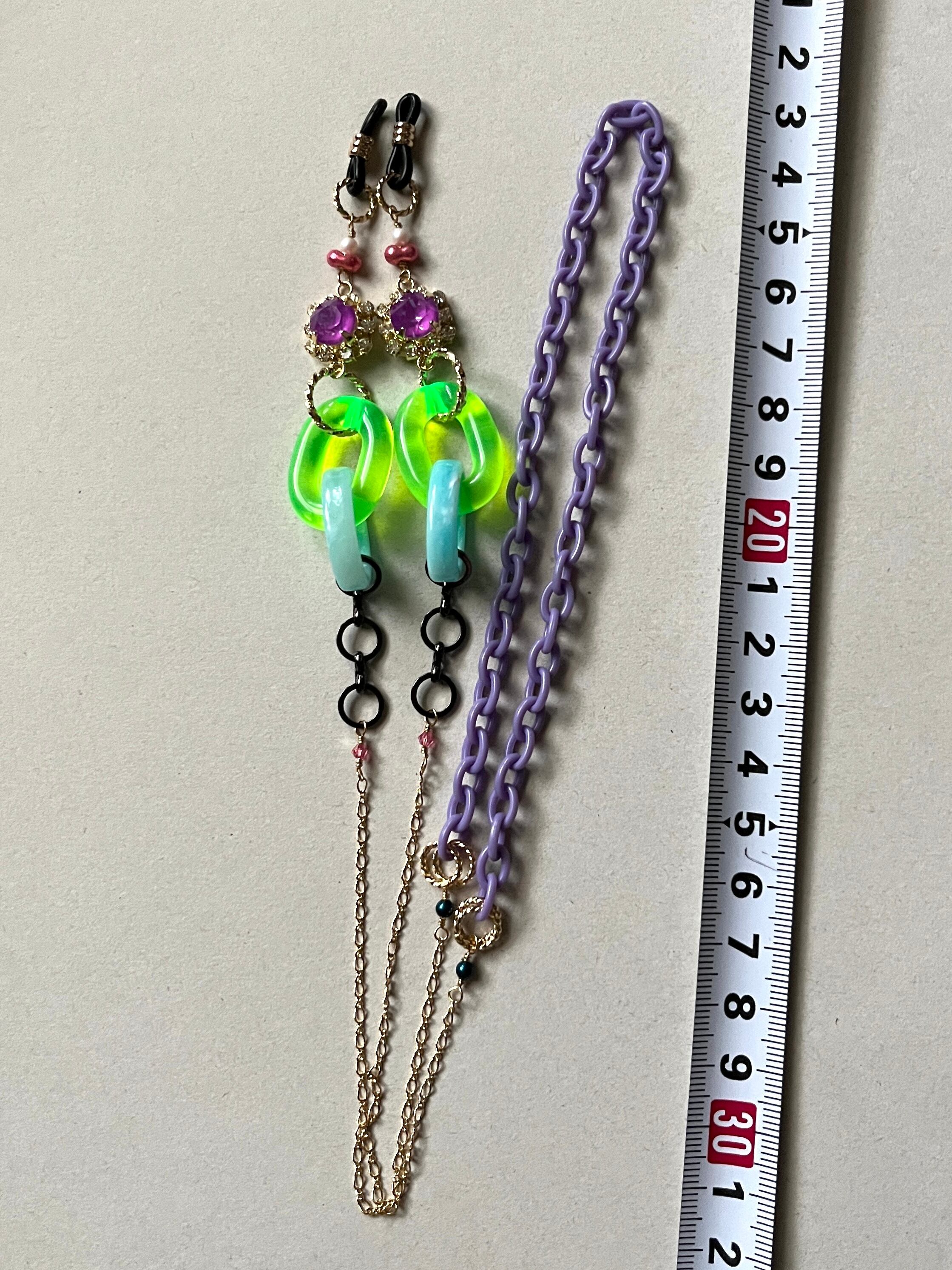 90sのサイバーファッションを思わせる蛍光チェーンやガラスストーンをメインに
