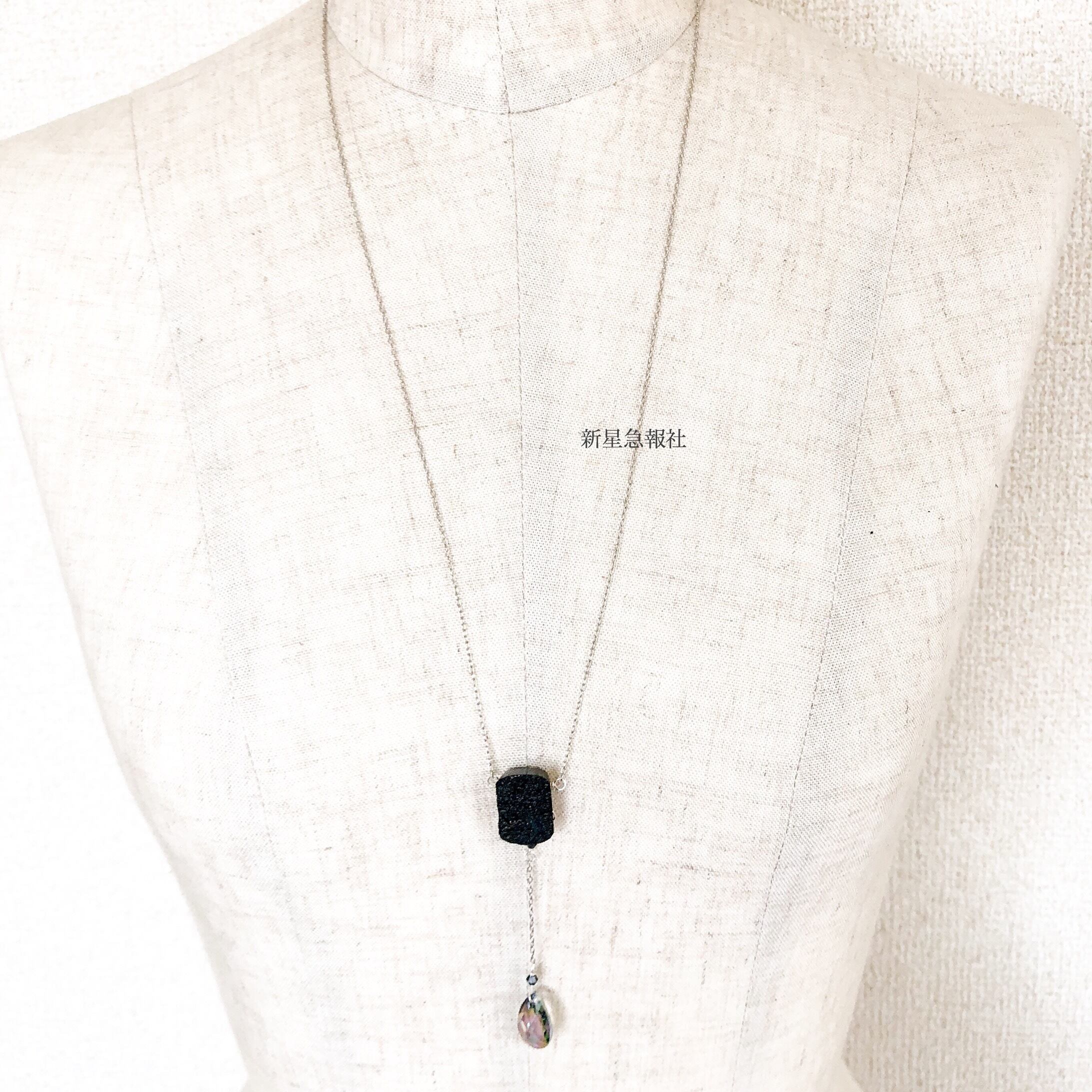 アクセサリーはテクタイト、ブラックトルマリン、アイオライト