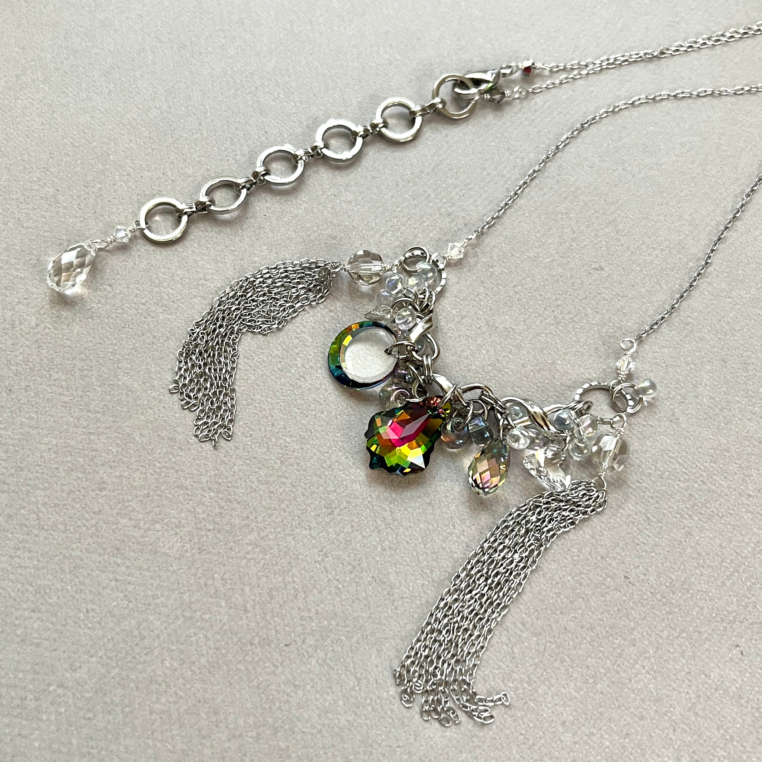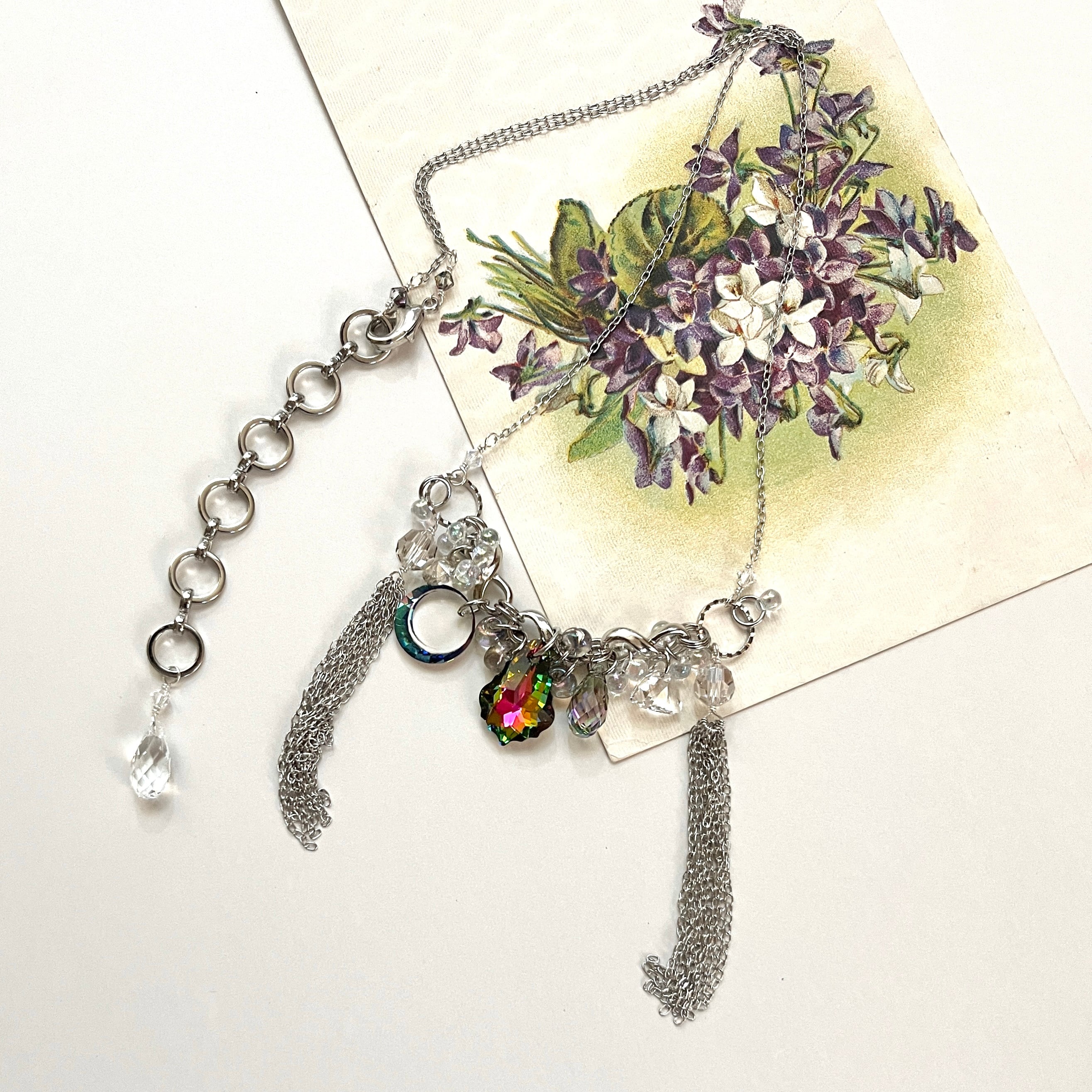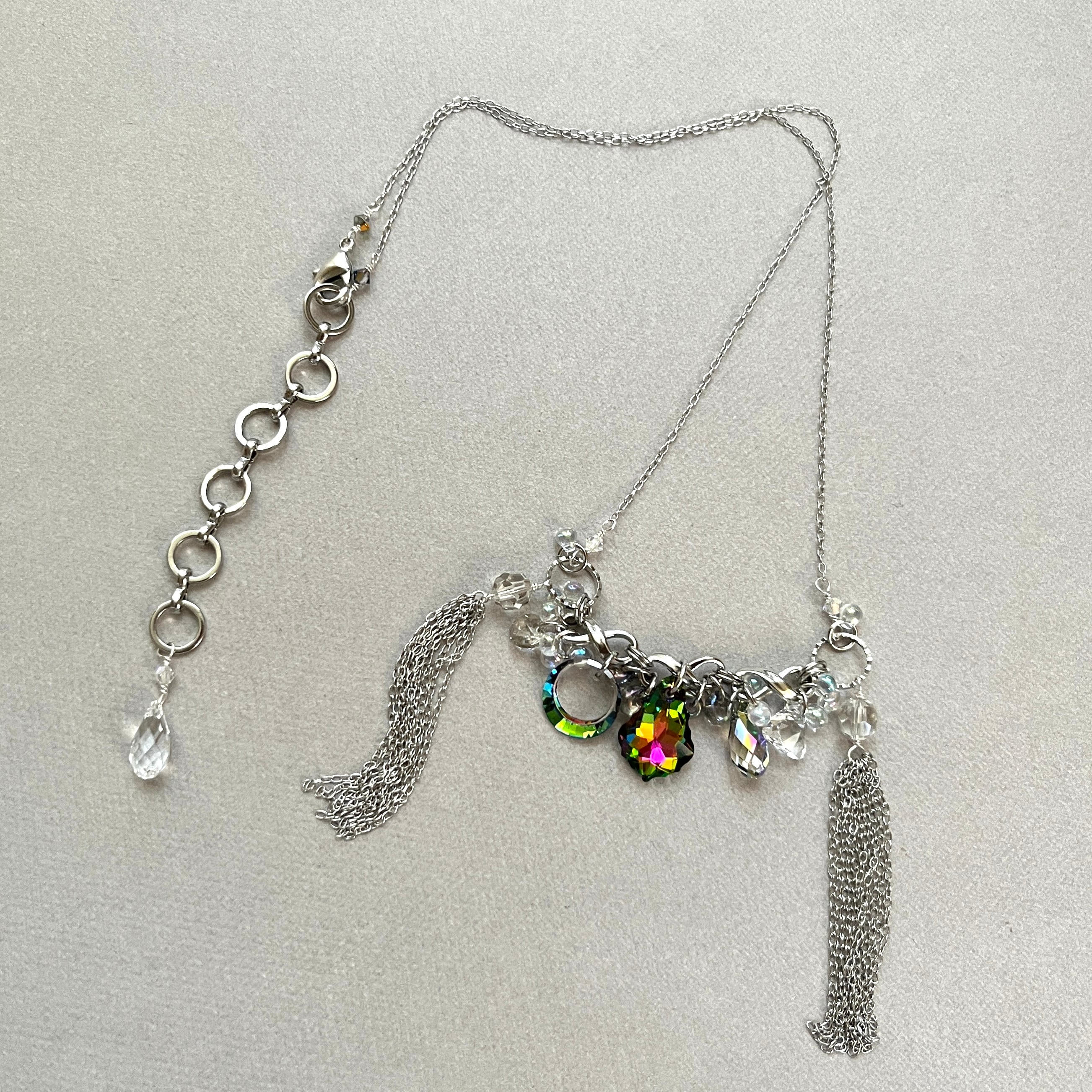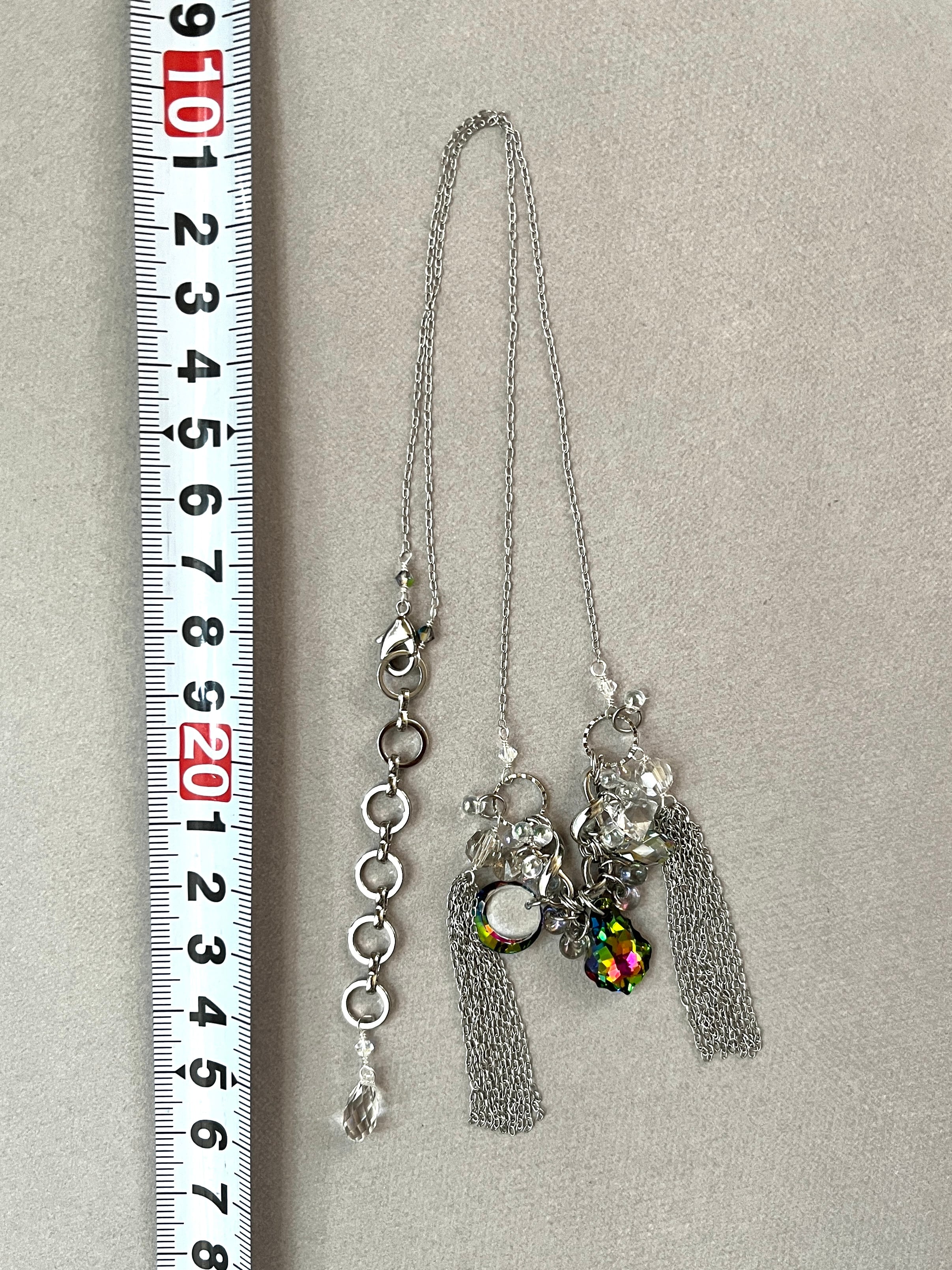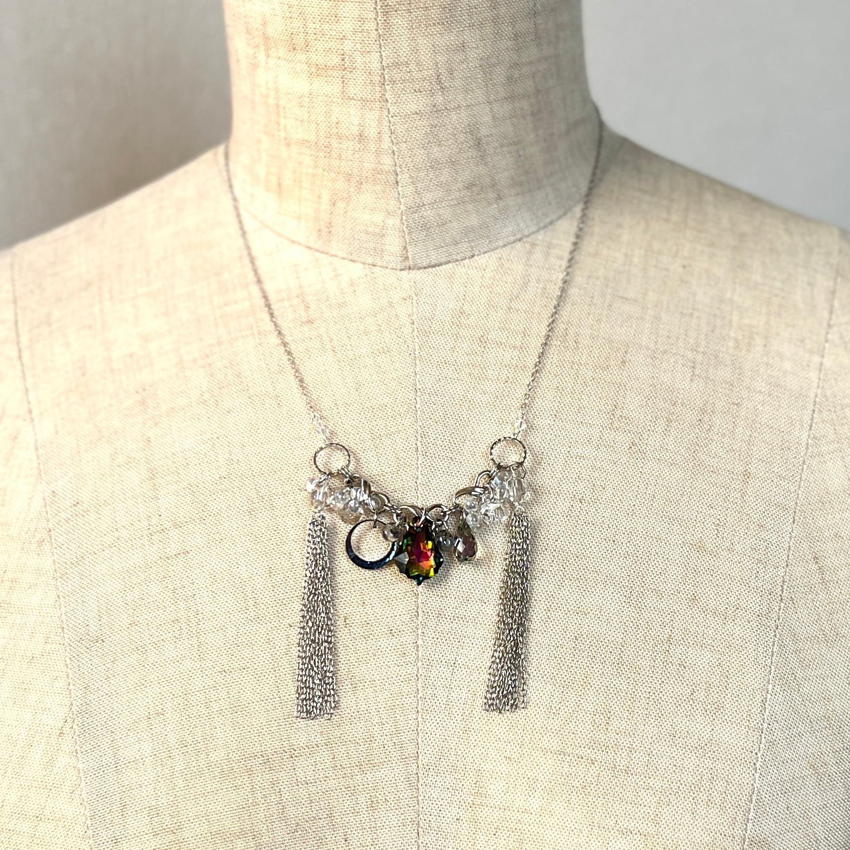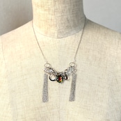 存在感のあるガラスパーツを並ぶ酒瓶のように連ねてネックレスに仕立てました
