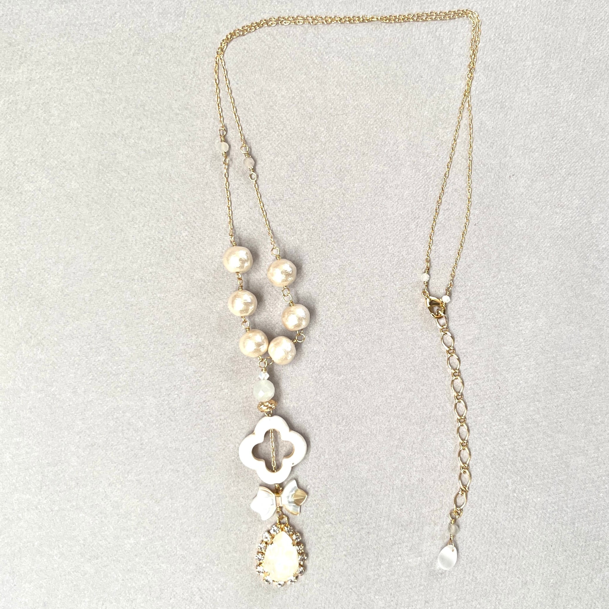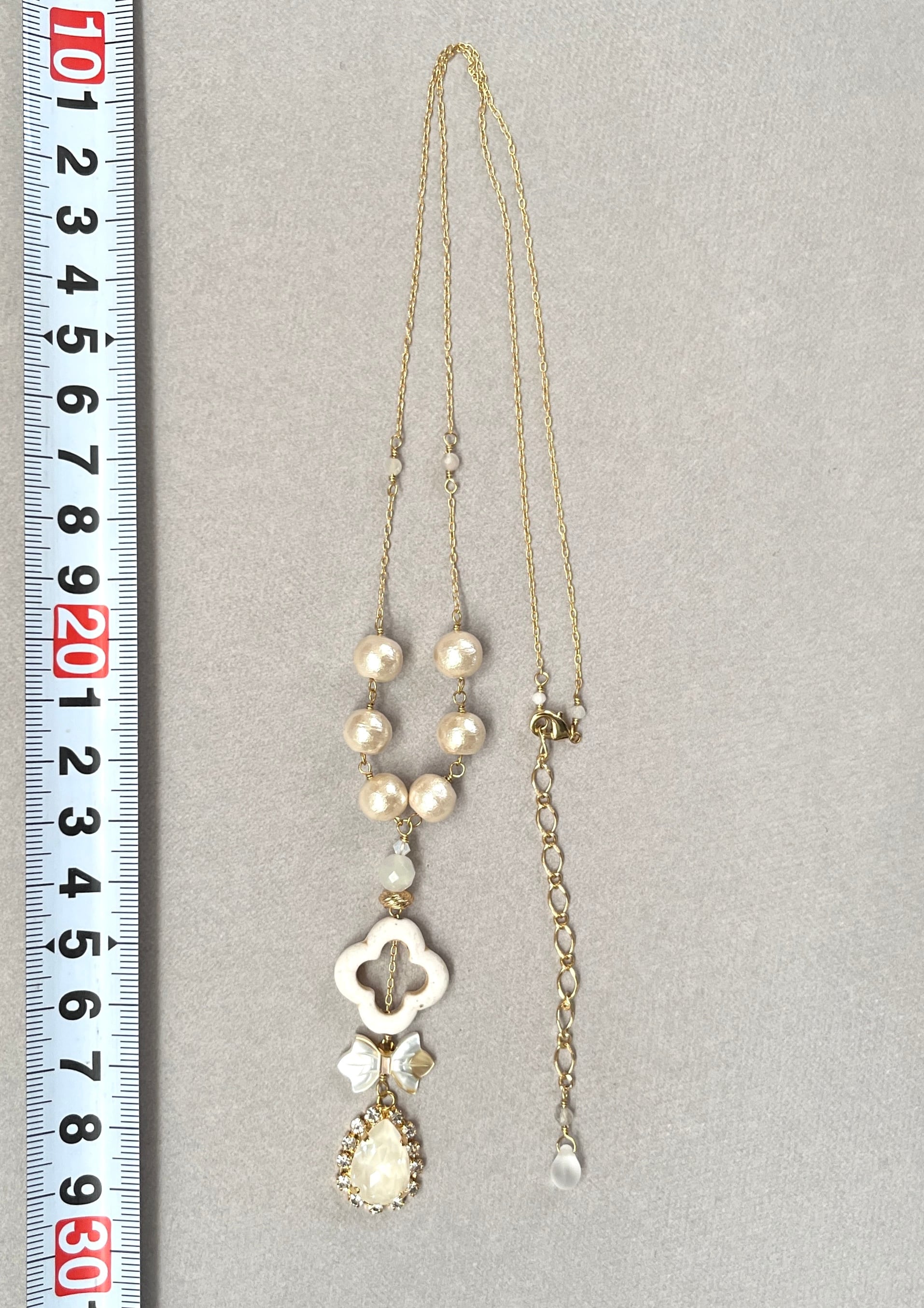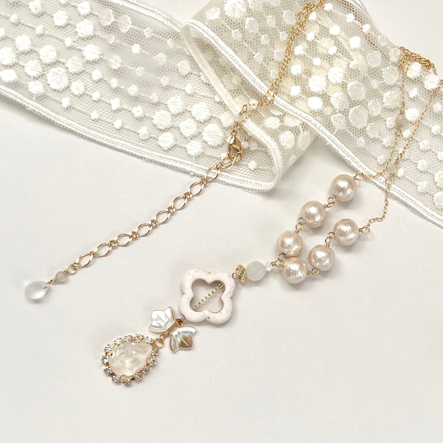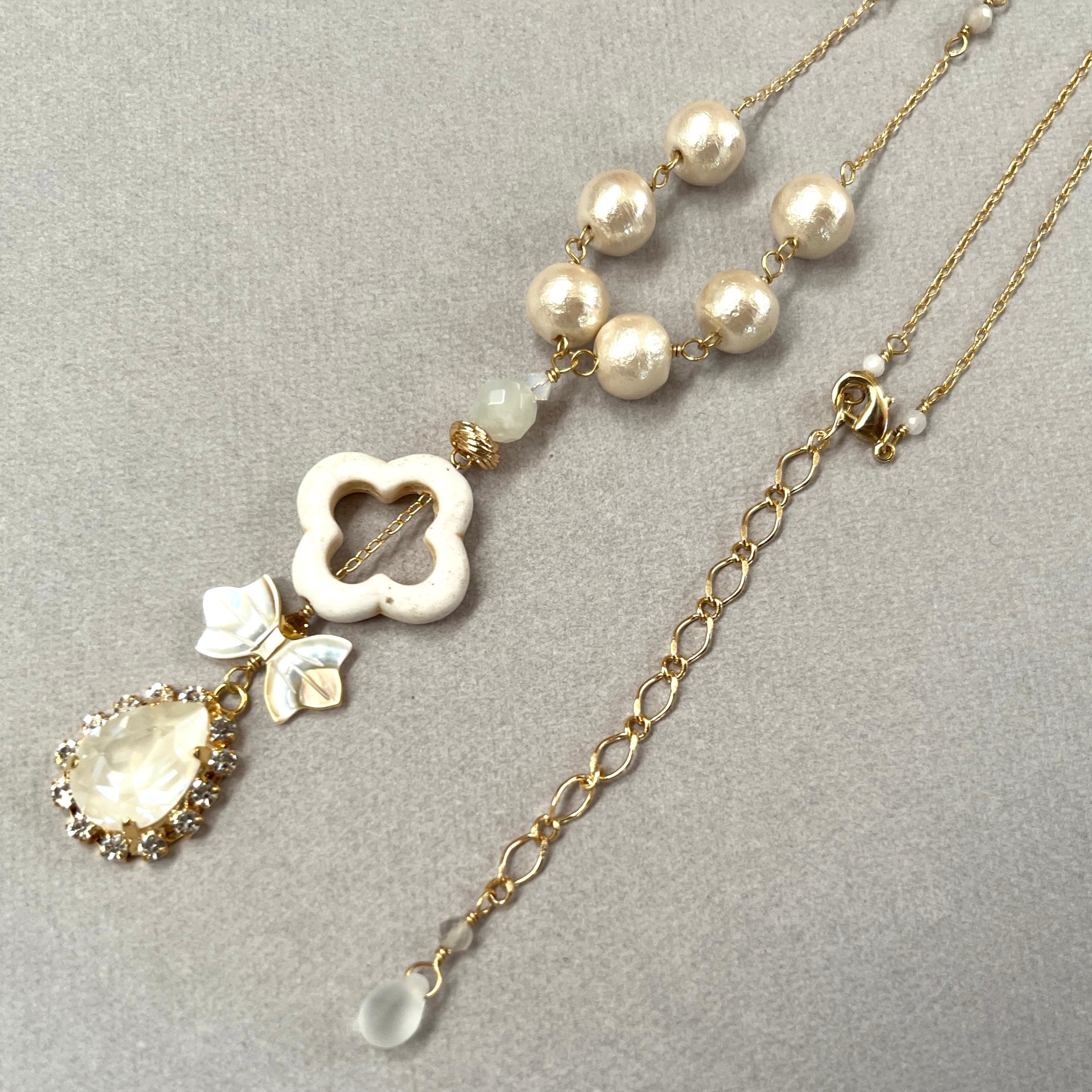 コットンパールや貝、石、ガラスといった様々な素材をつないだ