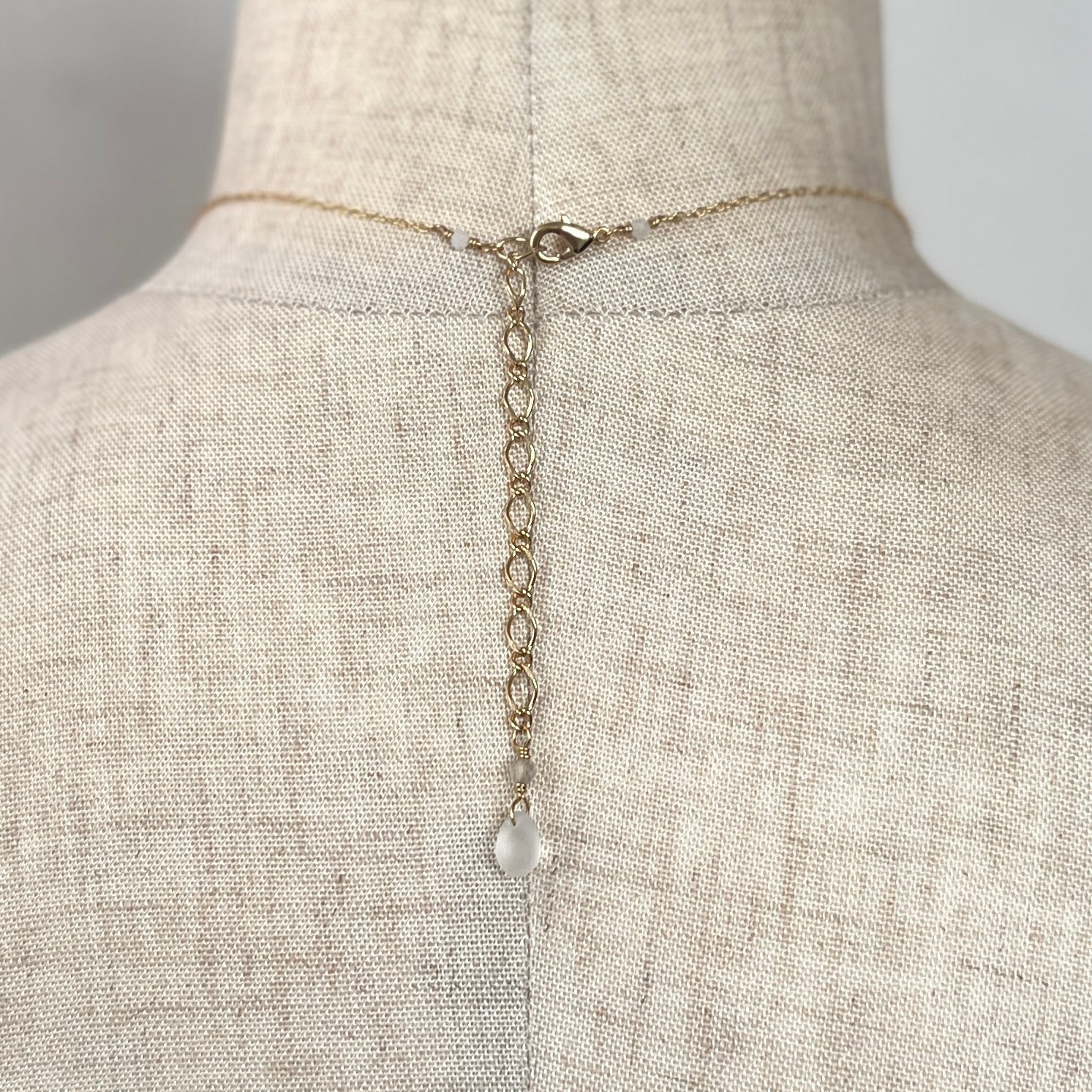 現在はカニカンを右手で持ち、背中のほうで留める形状です。