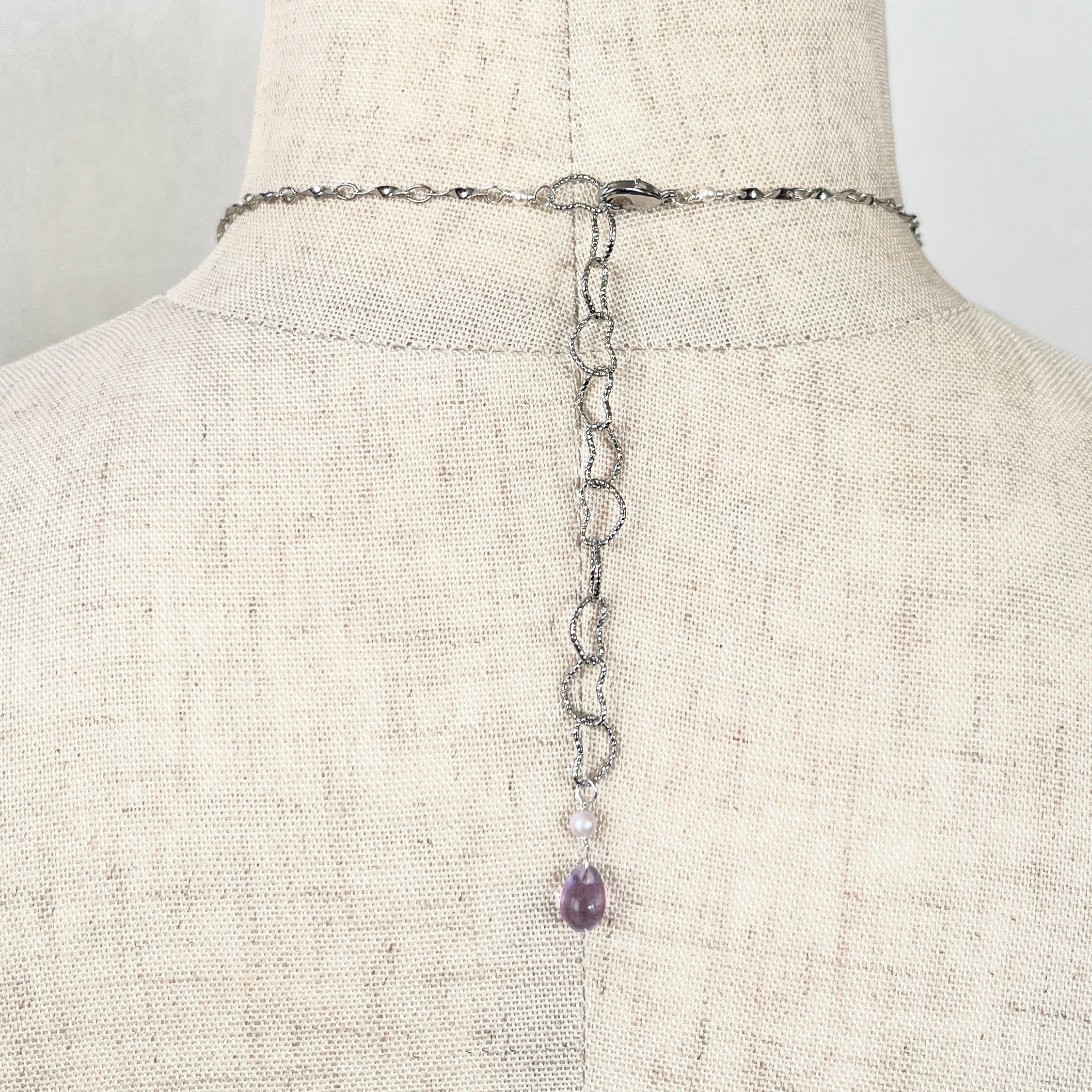 現在はカニカンを右手で持ち、背中のほうで留める形状です。