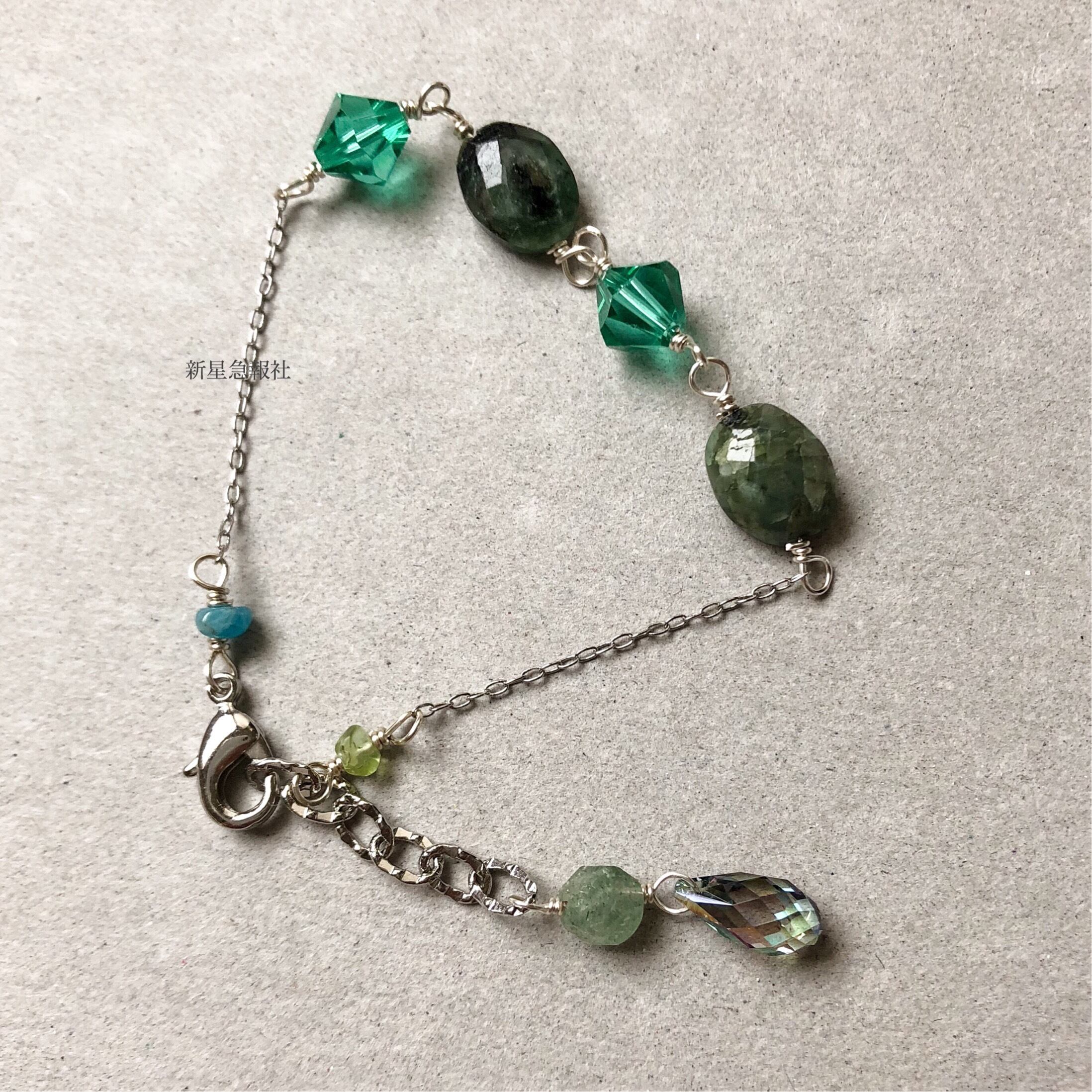 アクセサリーはエメラルド、グリーンアベンチュリン