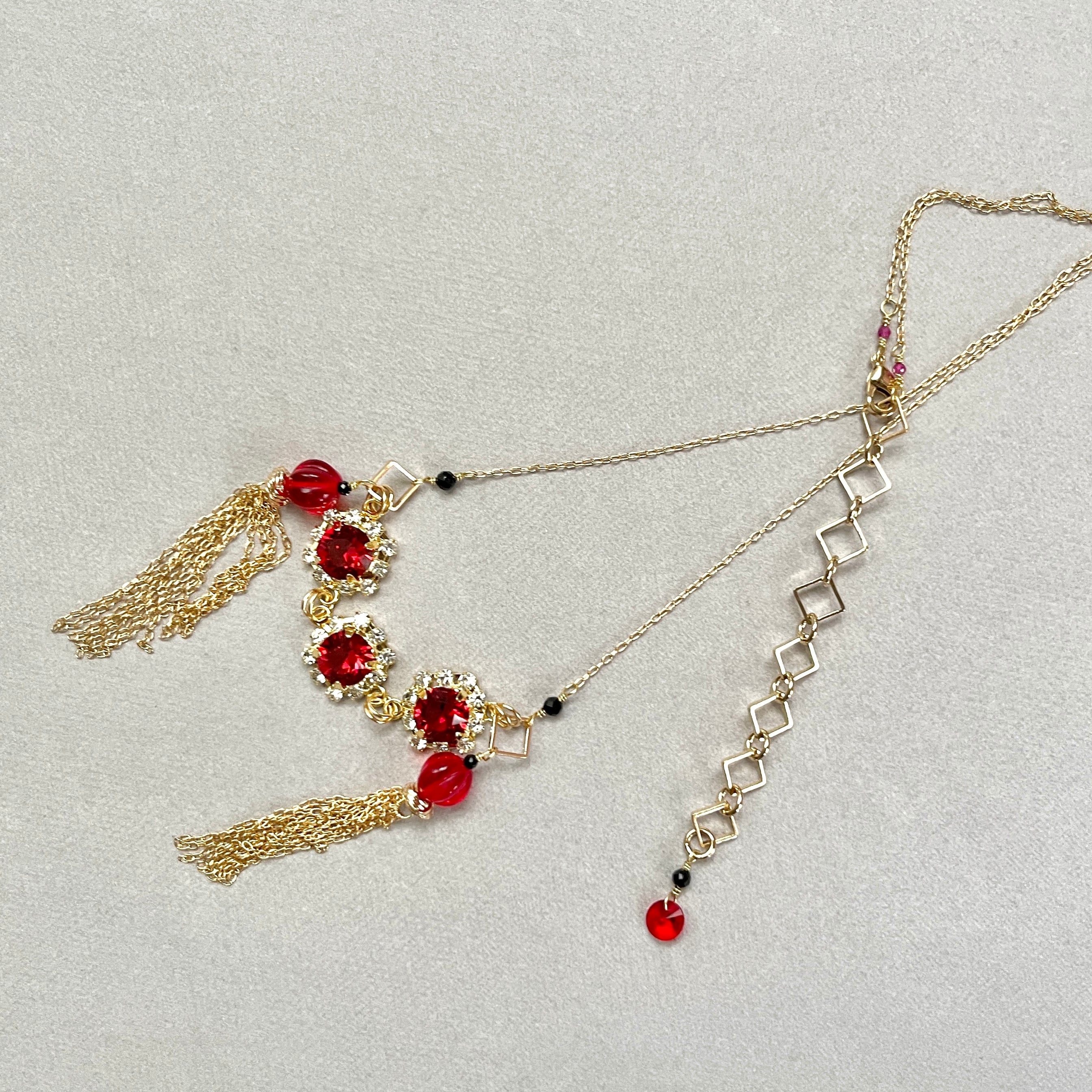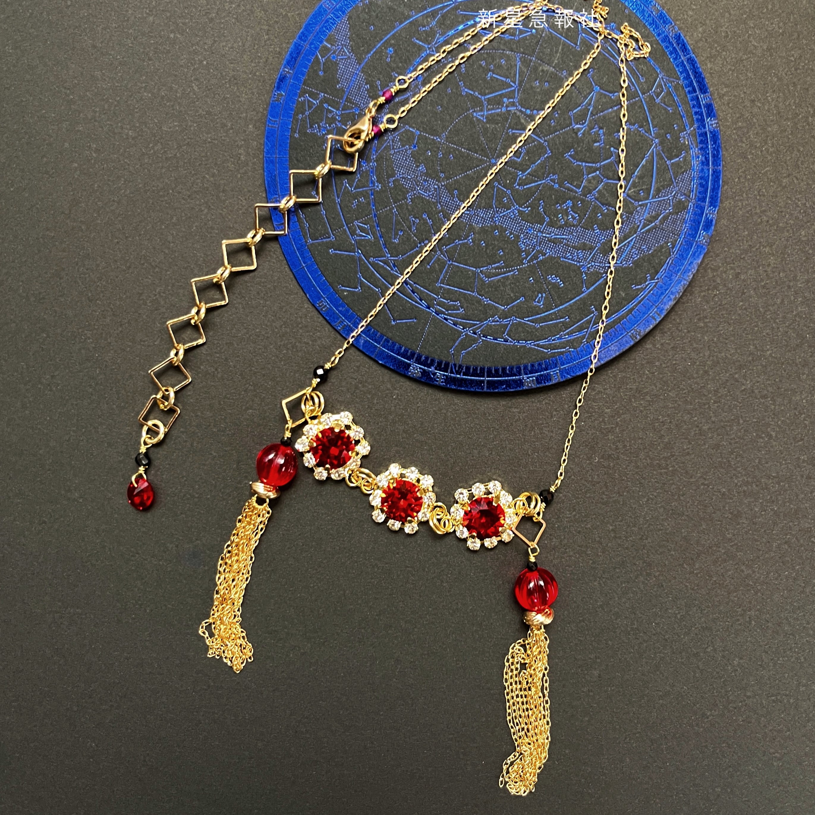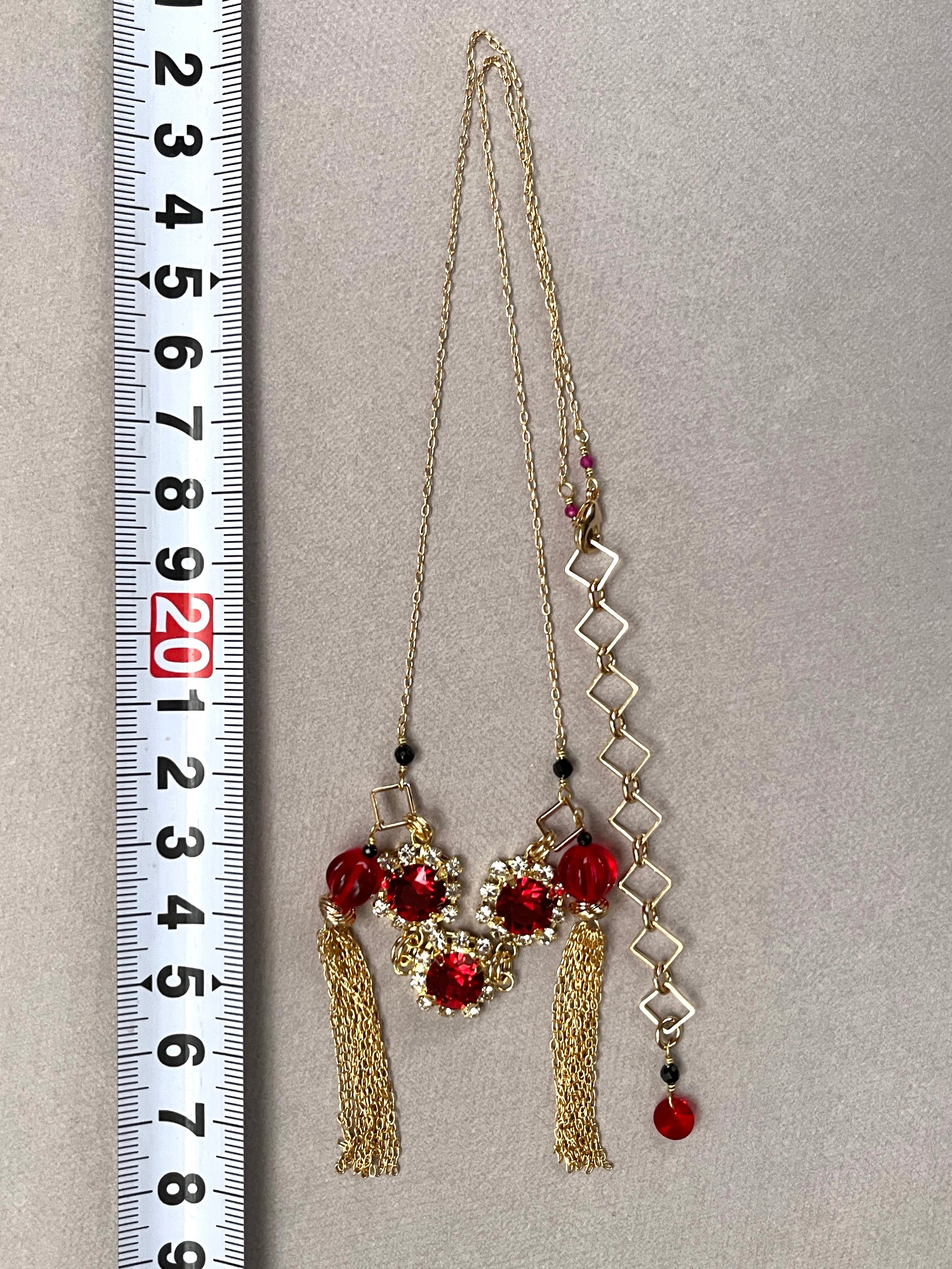 澄んだ鮮やかな赤色のガラスが印象的なネックレス。