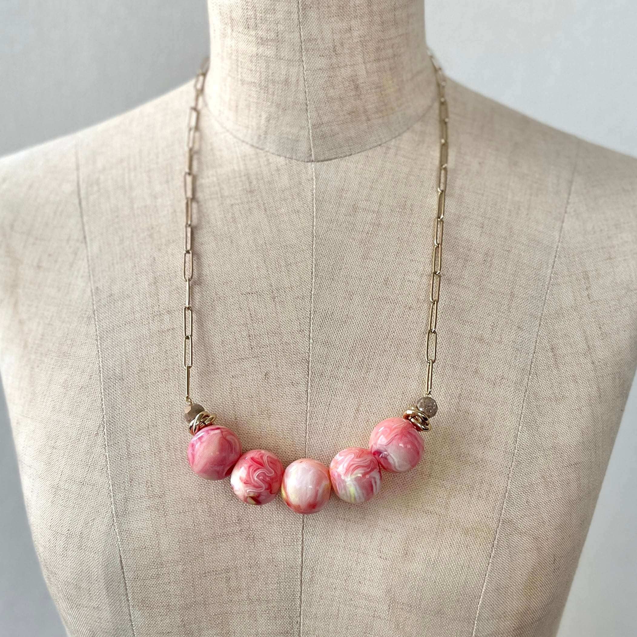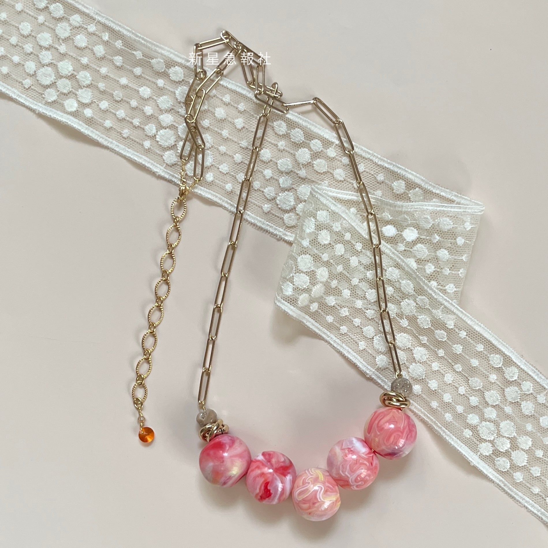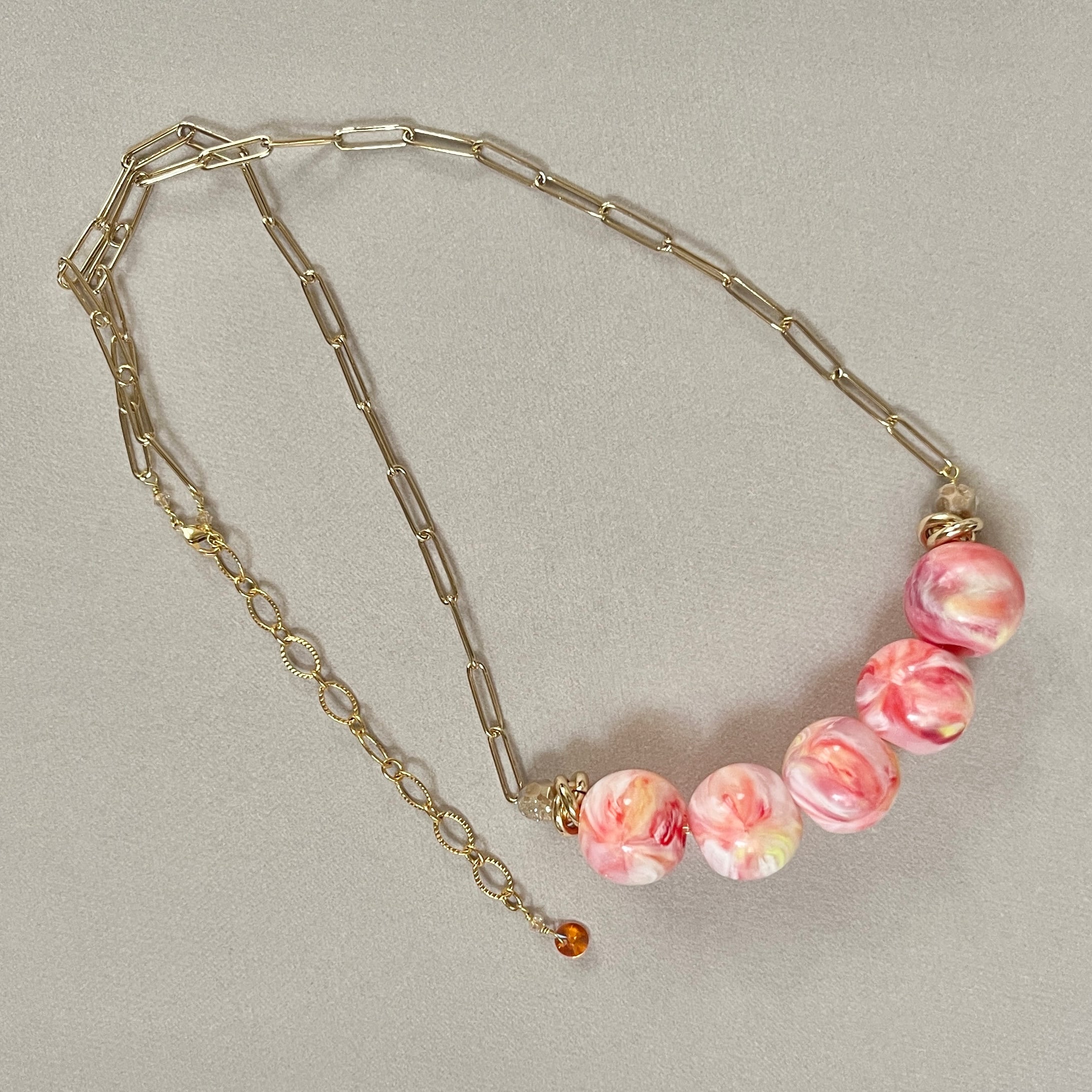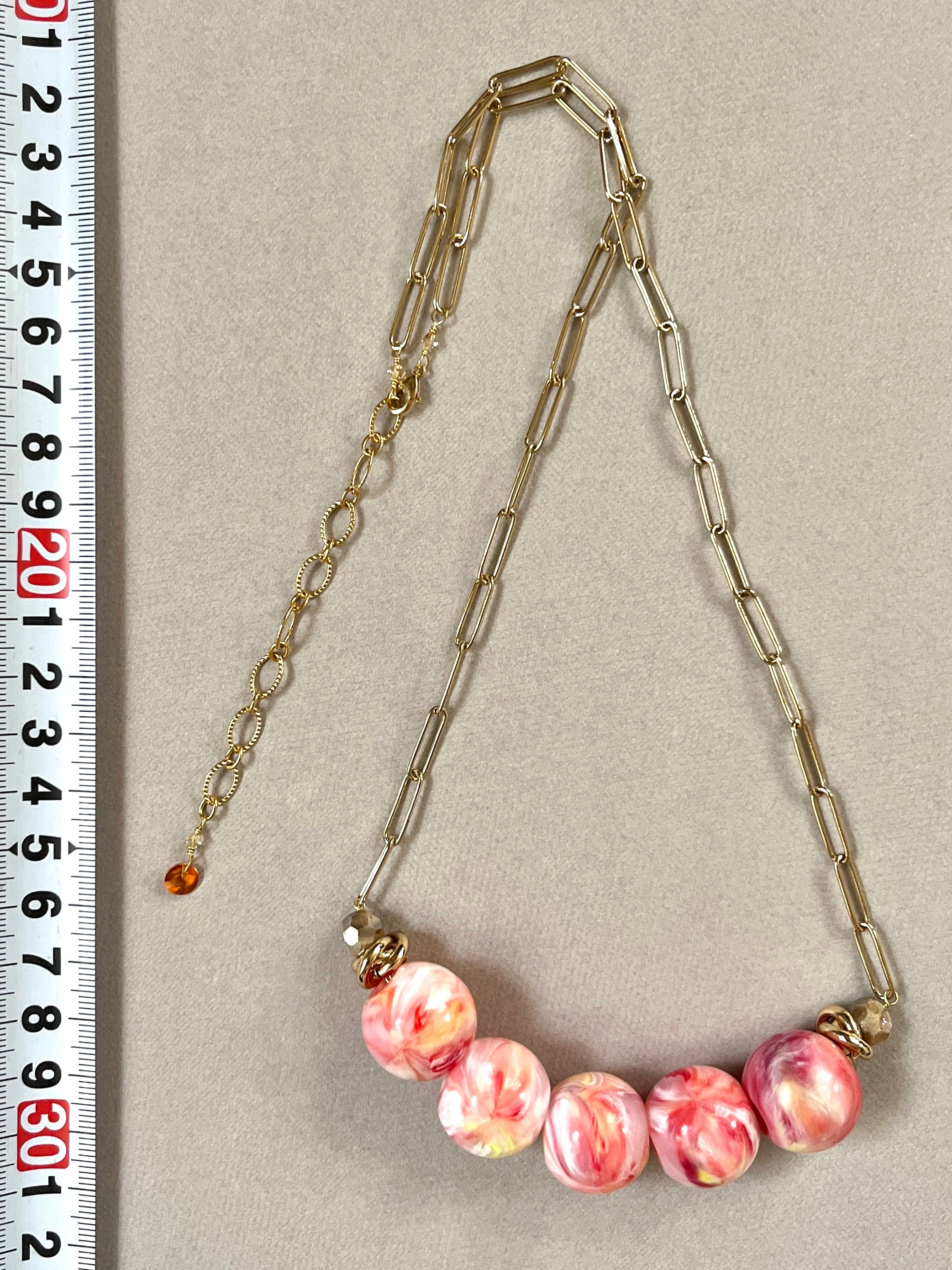 赤を中心にしたインパクトのあるマーブリングビーズをメインにしたネックレスです