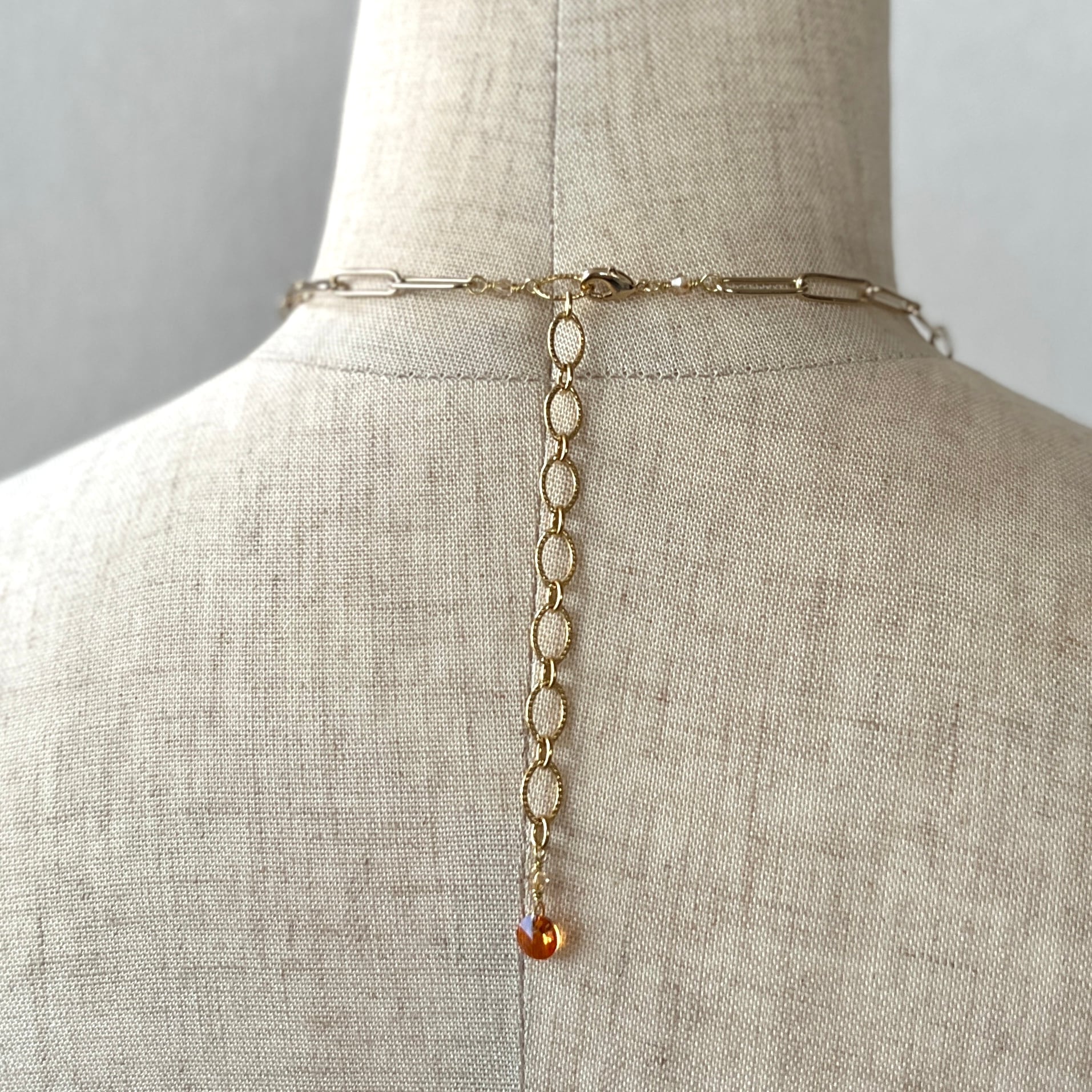 現在はカニカンを右手で持ち、背中のほうで留める形状です。
