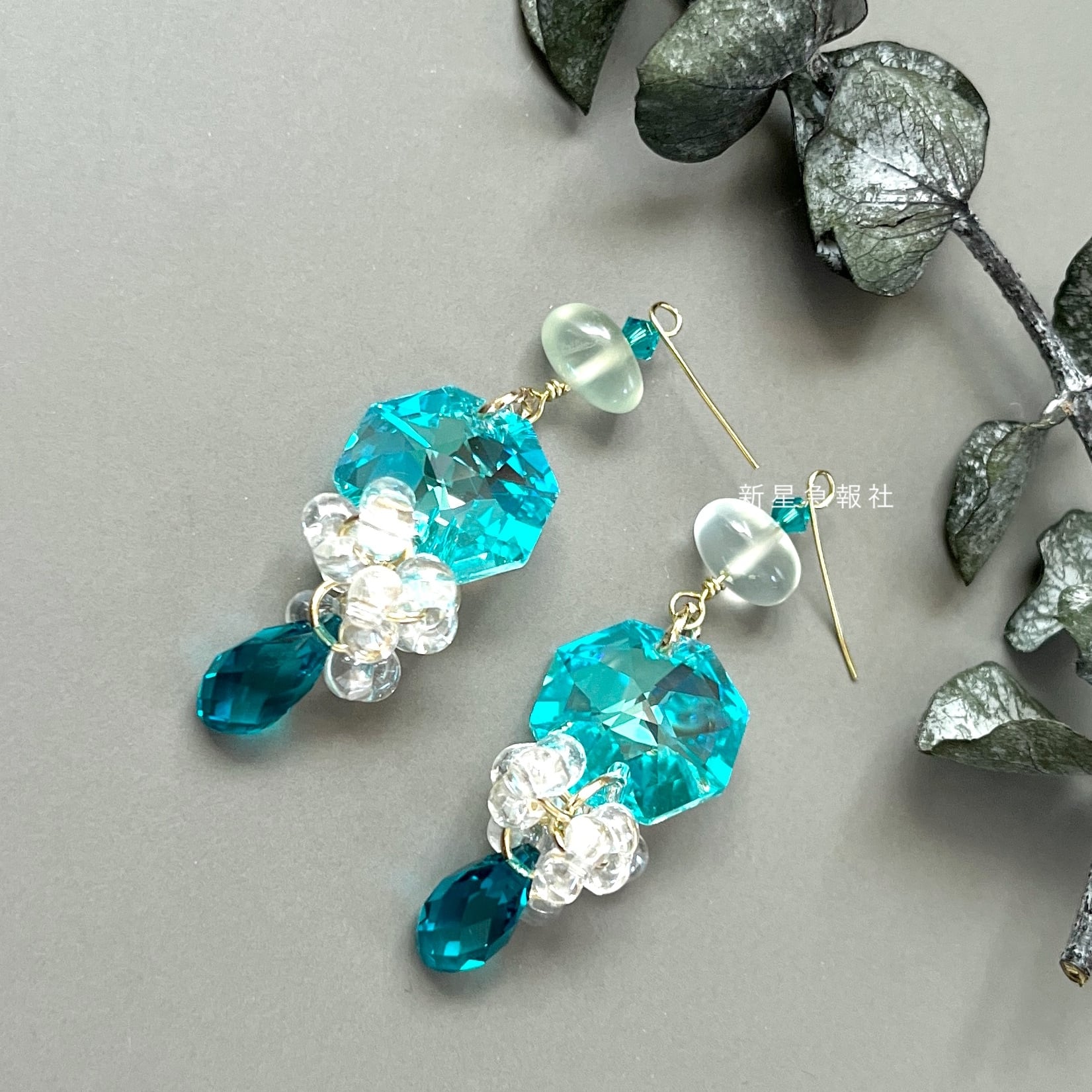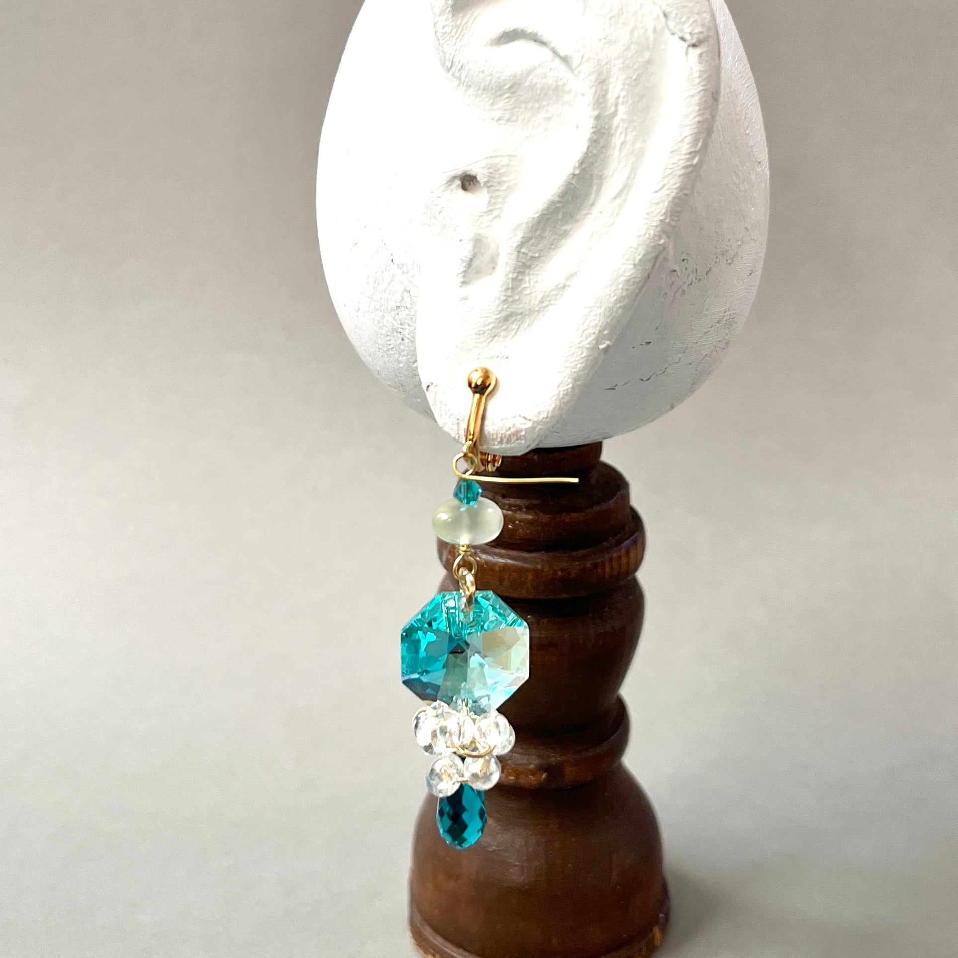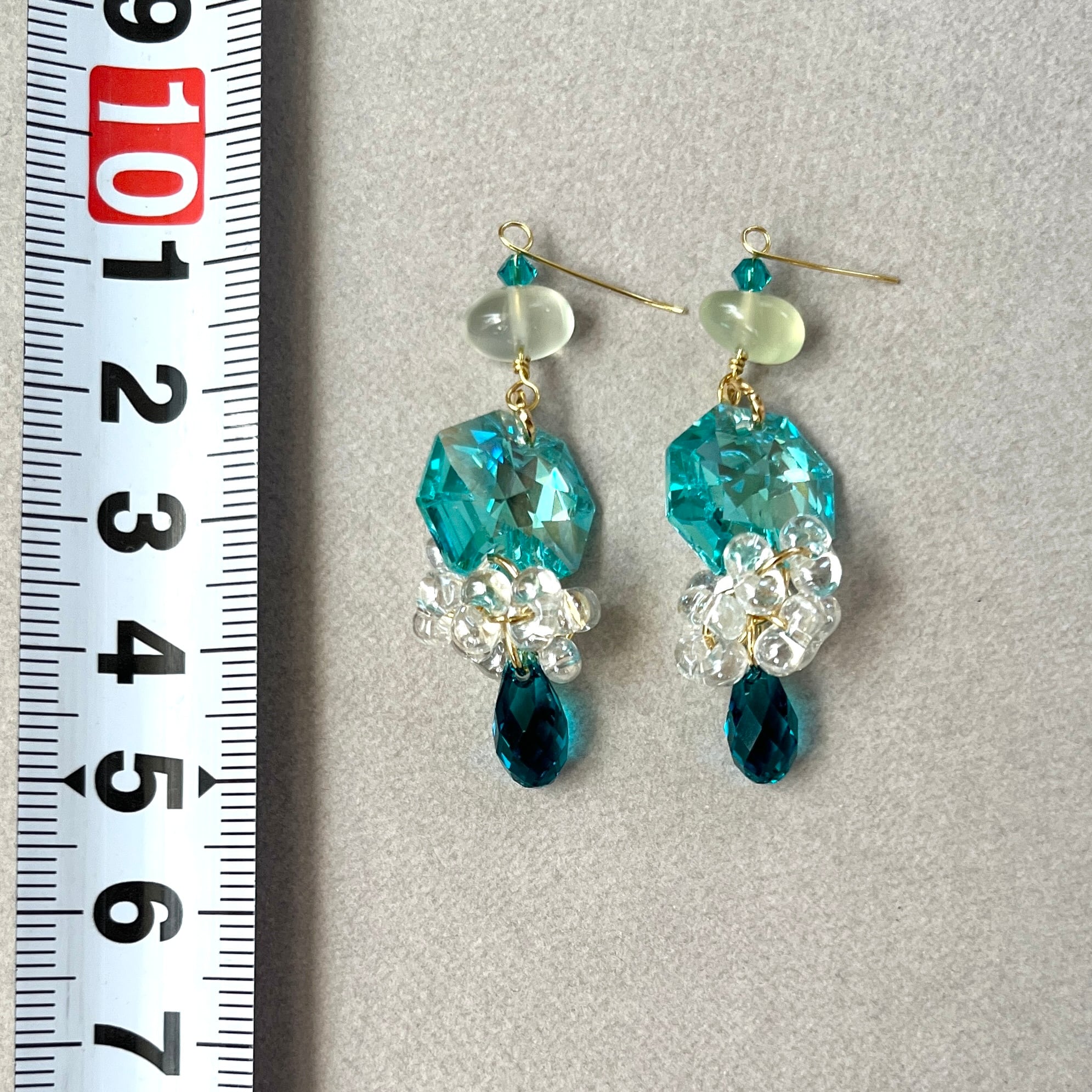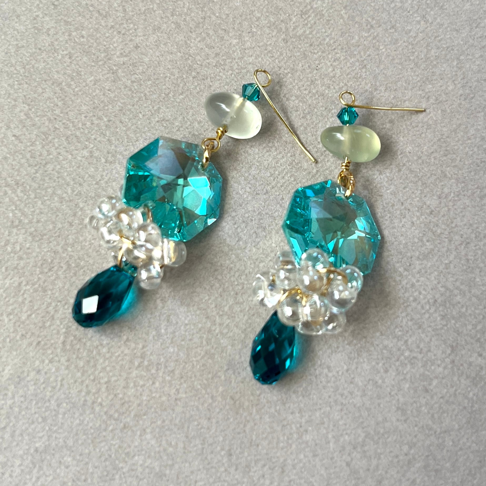 ブルーグリーンのシャンデリアパーツに、少し濃い色のドロップを下げました