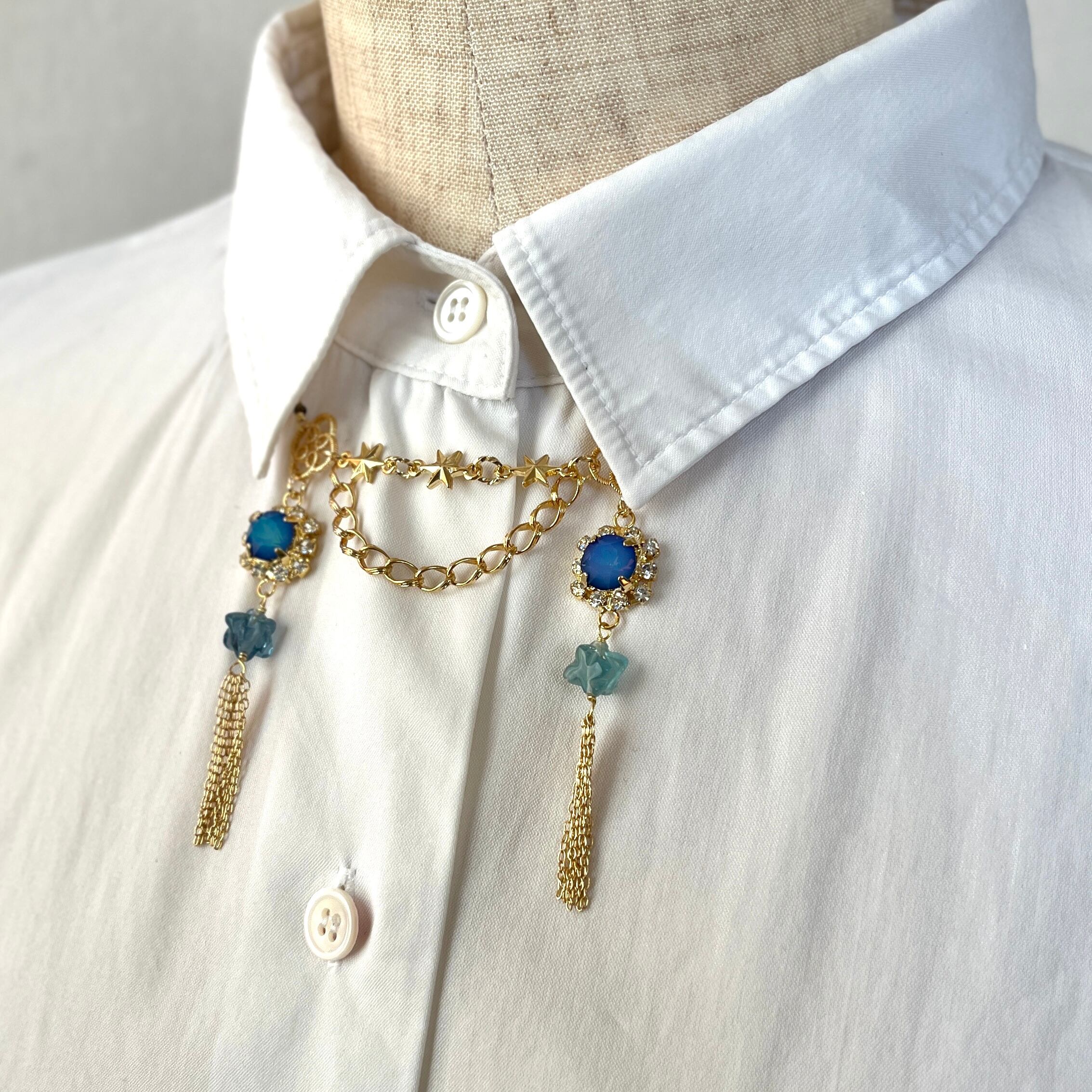 シャツの襟にぴったりとあわせていただきたく、短めのデザイン。