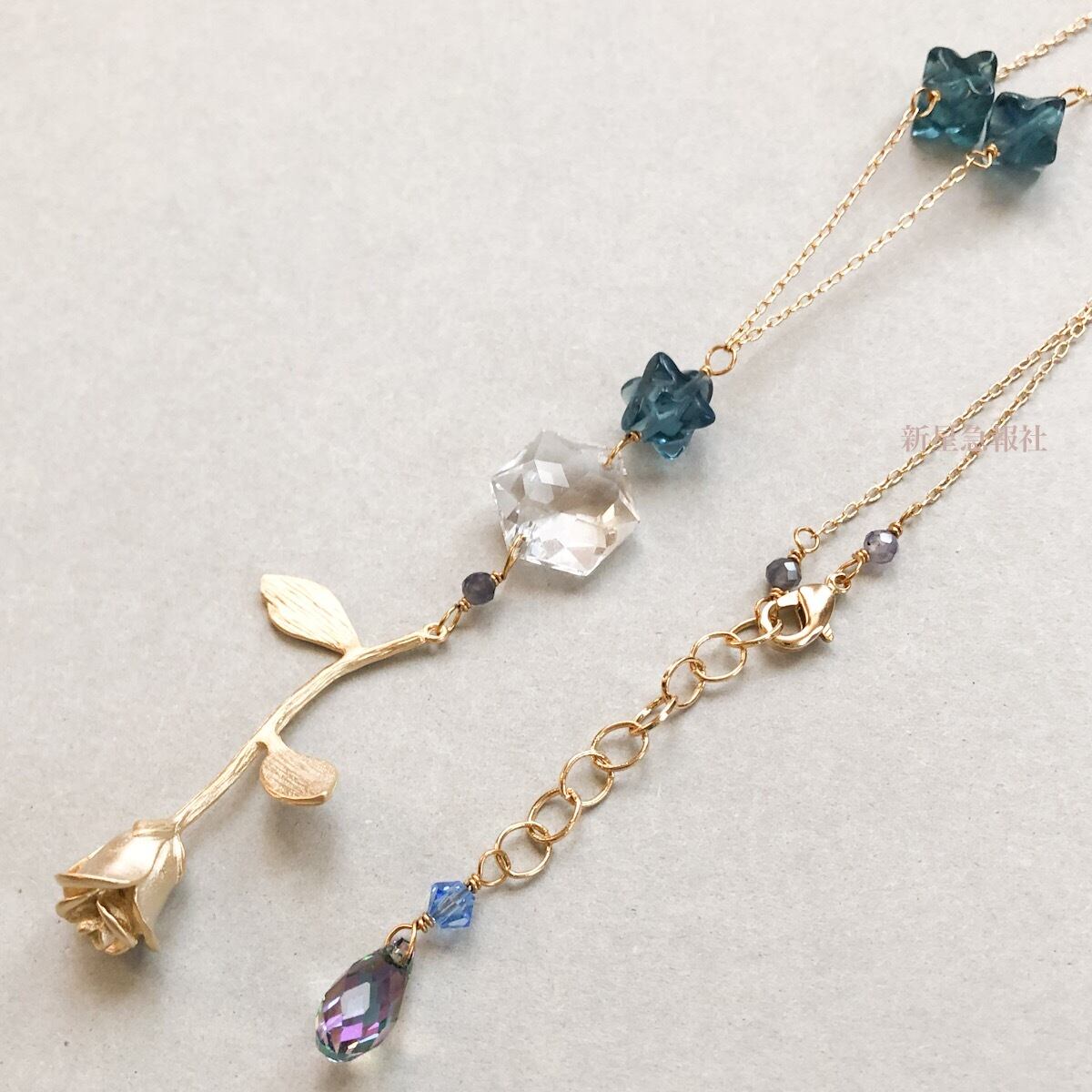 アクセサリーはフローライト、アイオライト、ガラス(スワロフスキー社製)を含みます。
