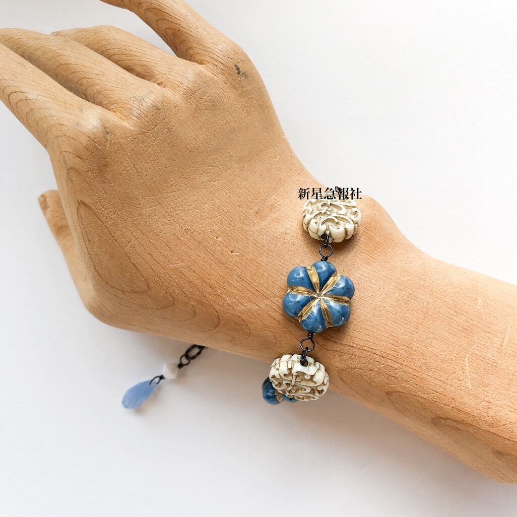 アクセサリーは樹脂素材、ガラス(チェコビーズ、スワロフスキー社製)を含みます。