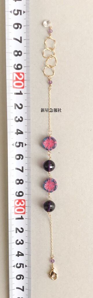 アクセサリーはアメシスト、ガラス(スワロフスキー社製、チェコビーズ)を含みます。