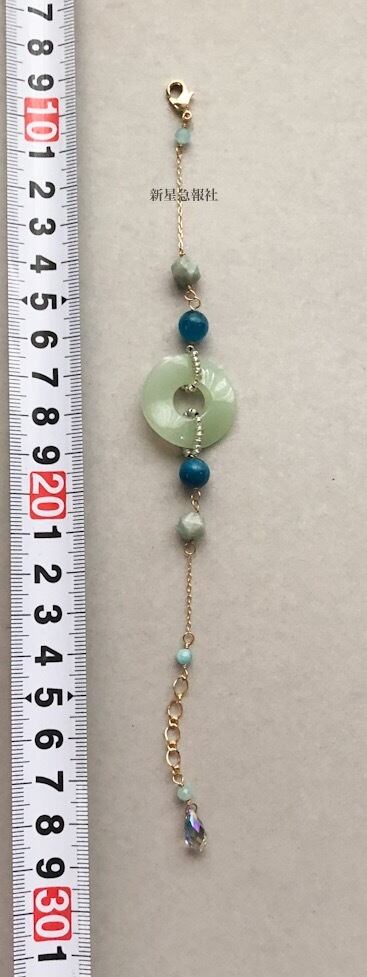 アマゾナイトシリカ、ガラス(一部スワロフスキー社製)を含みます。