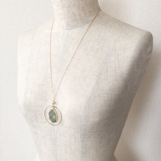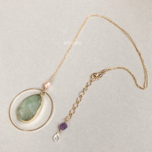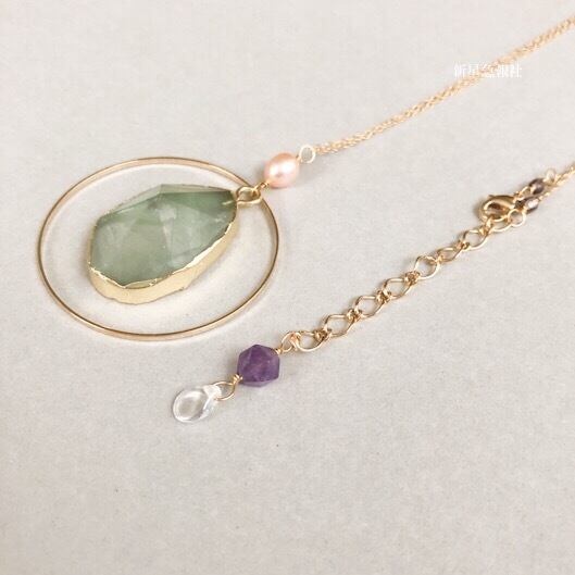 アクセサリーはフローライト、淡水真珠、アメシスト、