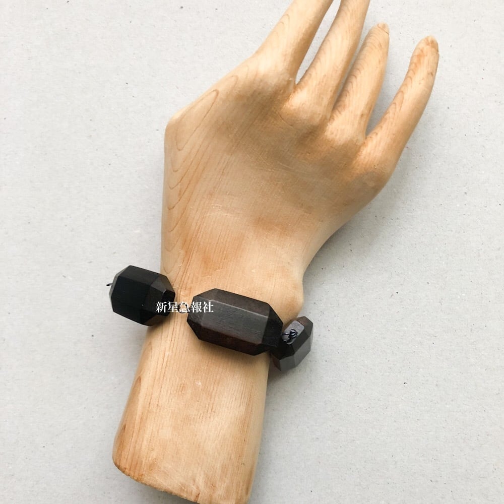 アクセサリーは木素材(黒檀)、ガラス(スワロフスキー社製)を