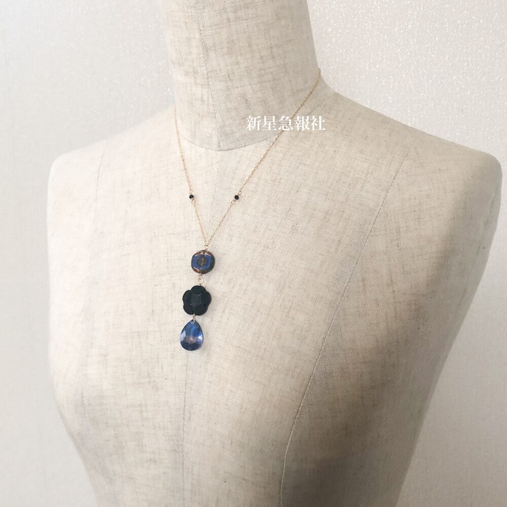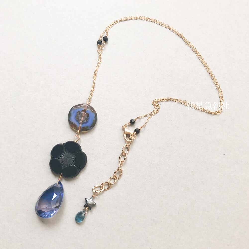アクセサリーはガラス(一部チェコビーズ)、スピネル、ヘマタイト、カイヤナイトを