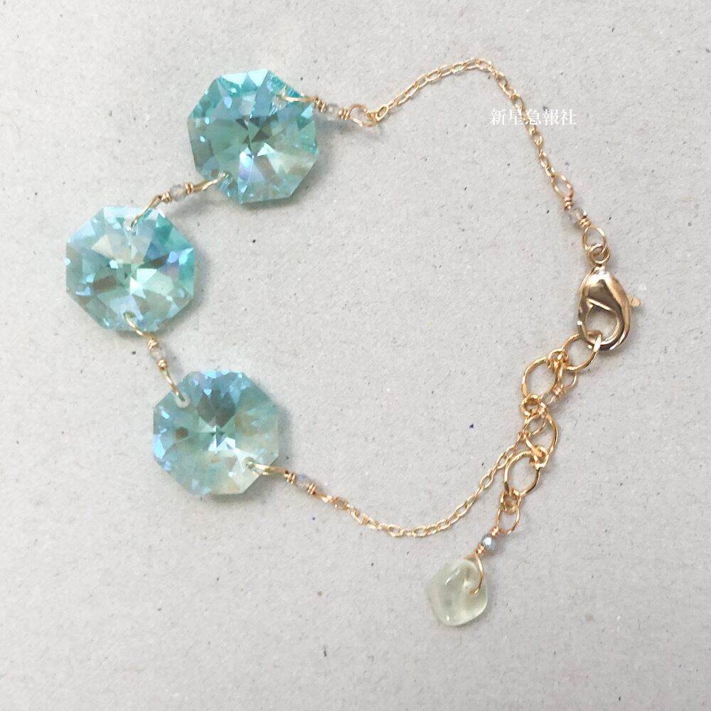 アクセサリーはプレナイト、ラブラドライト、ガラス(スワロフスキー社製)を含みます。