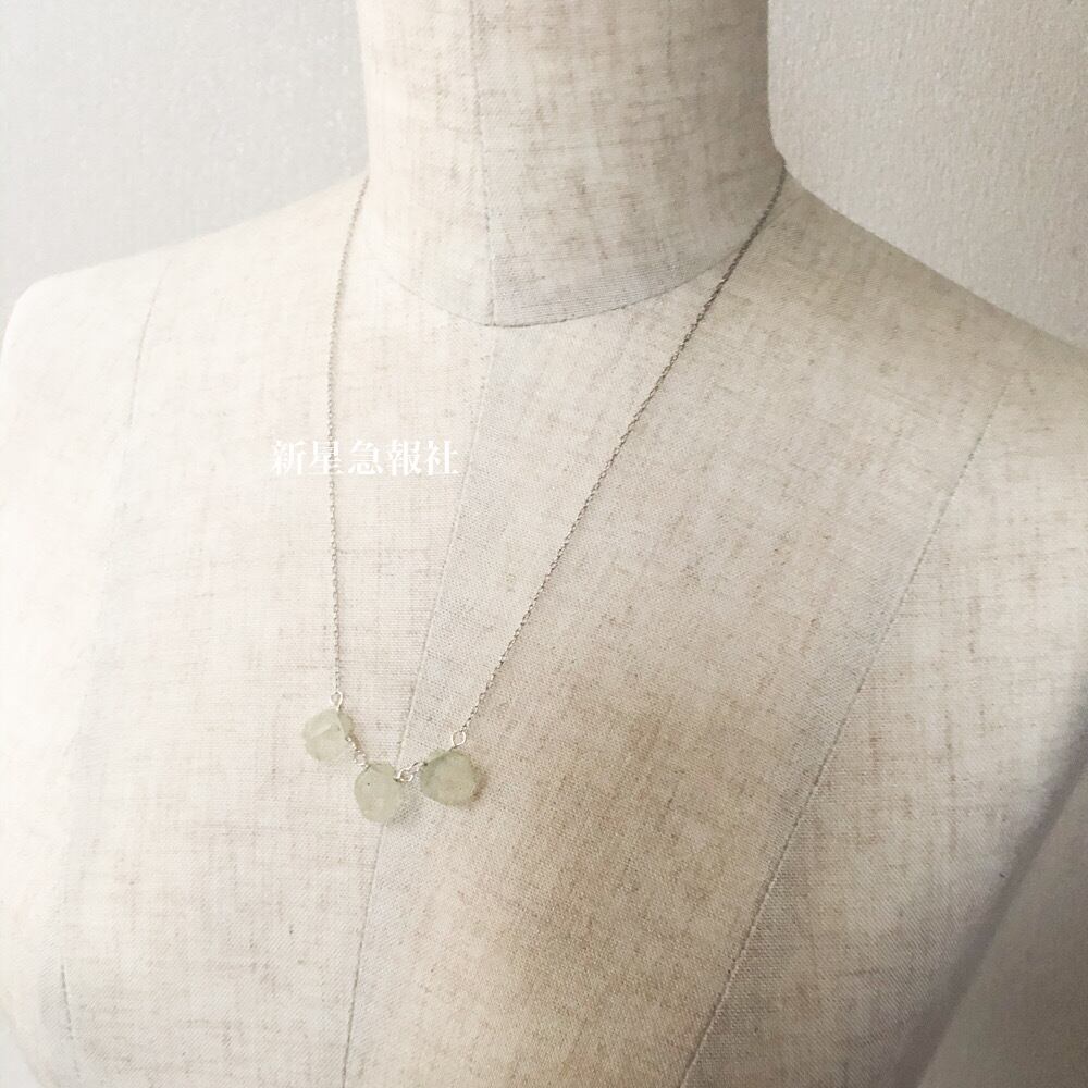 アクセサリーはガラス(一部チェコビーズ)、プレナイト、ペリドット、ムーンストーンを