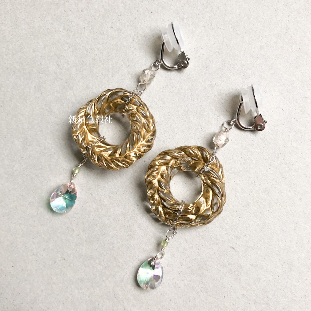アクセサリーは、樹脂素材、ペリドット、ガラス(インドビーズ、スワロフスキー社製)を含みます