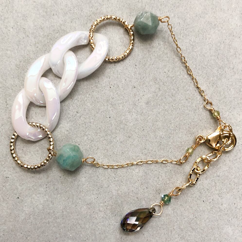 アクセサリーは樹脂素材、アマゾナイト、ガラス(スワロフスキー社製)を含みます。