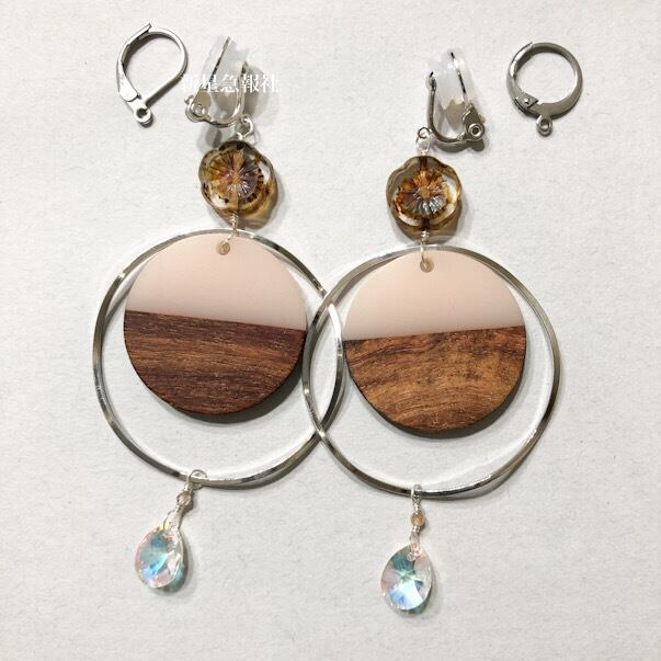 アクセサリーは木・樹脂貼り合わせ素材、ジルコン