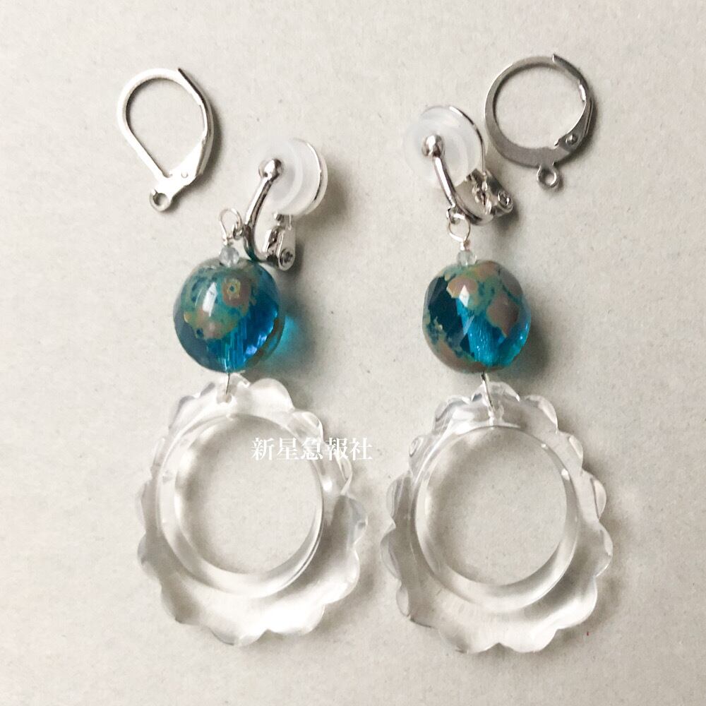 アクセサリーは樹脂素材、ガラス(チェコビーズ)、アクアマリンを含みます