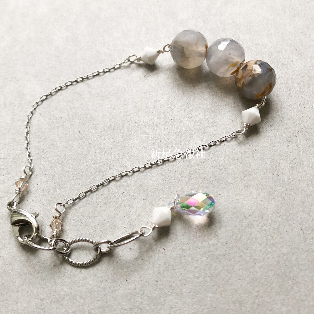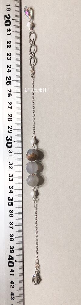 アクセサリーはブルーカルセドニー、ガラス(スワロフスキー社製ビーズ)を含みます。