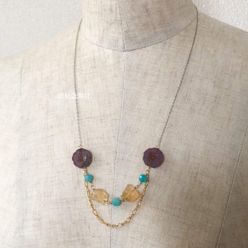 ガラス(一部チェコビーズ、スワロフスキー社製)、水晶