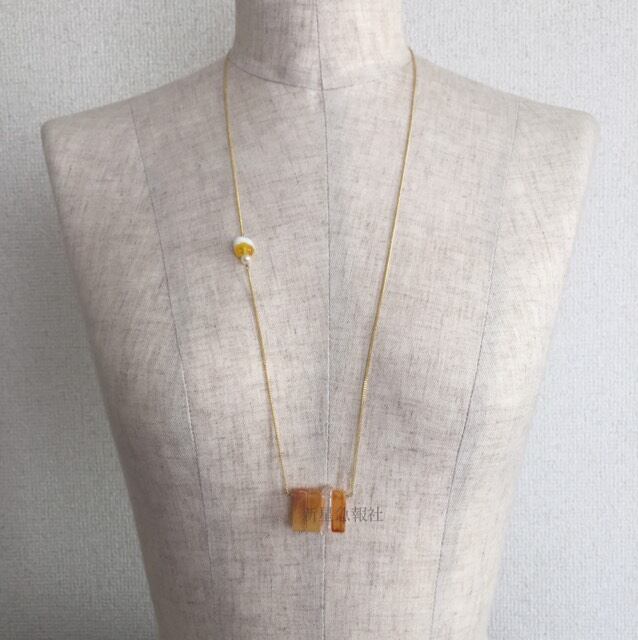 一部に樹脂素材(ドイツ製ヴィンテージ)、水晶、淡水真珠、マザーオブパール、ガラスを使用しています。
