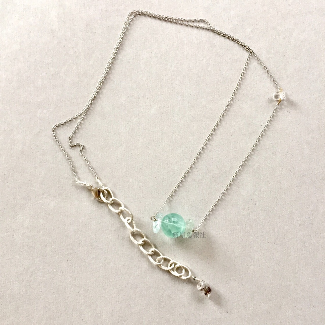 一部にフローライト、アクアマリン、水晶、ガラス、アルミチェーンを使用しています。