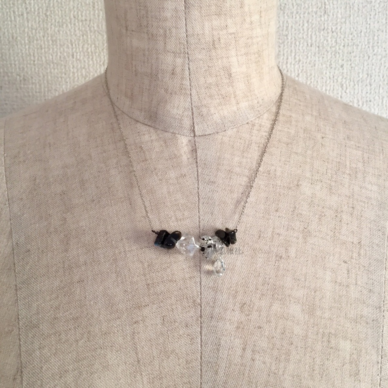一部にラッカーで着色された水晶と合成オパール、水晶、ガラスビーズを使用