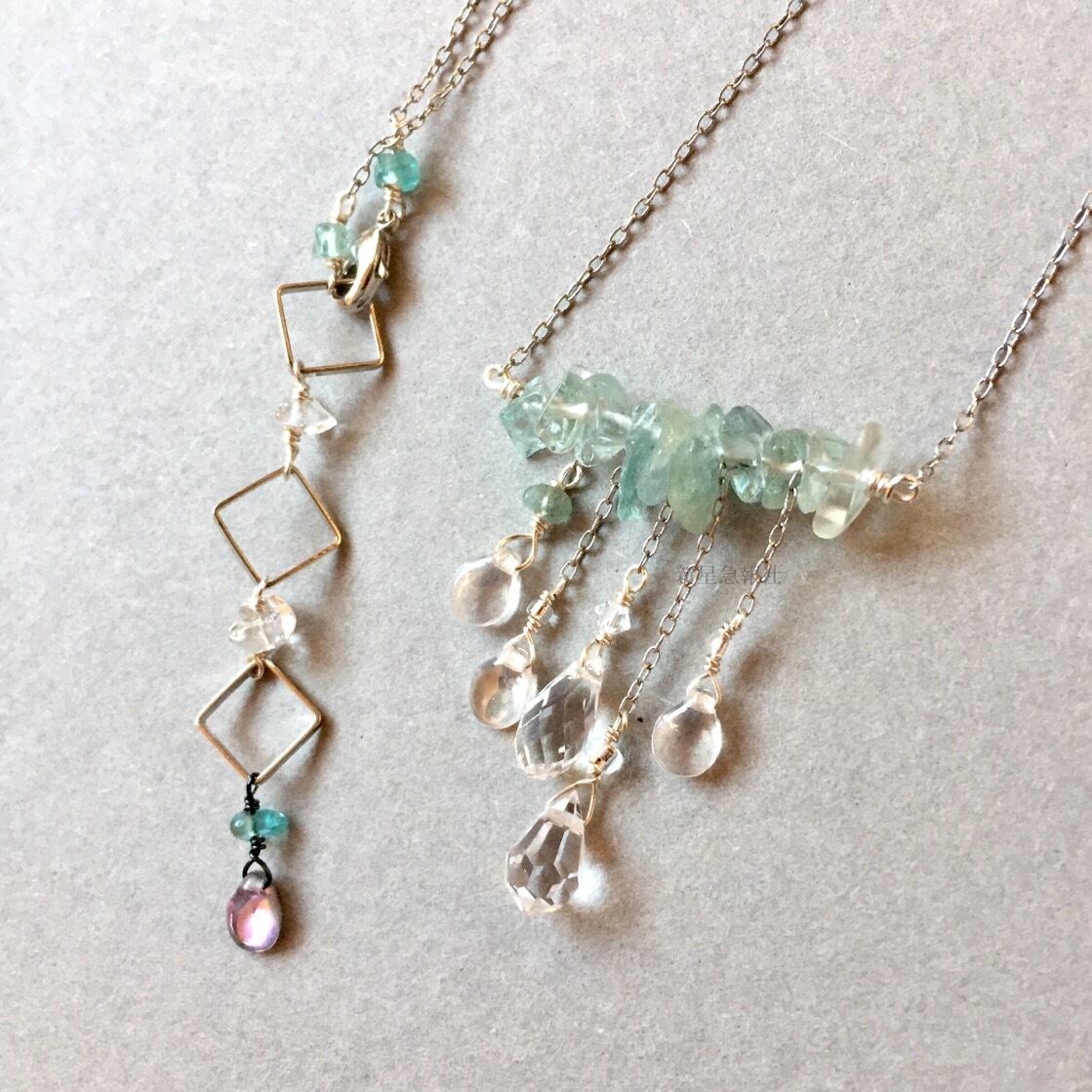 一部にアクアマリン、水晶、スワロフスキー、ガラス、アパタイトを使用