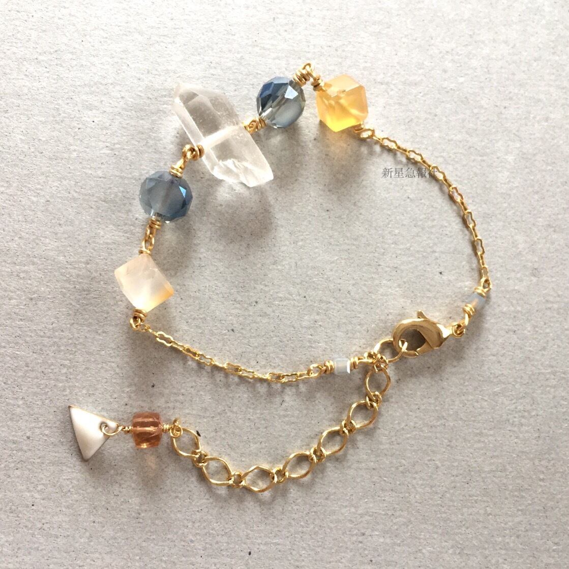 アクセサリーは一部に水晶、カーネリアン、ガラス、天然ジルコンを使用。