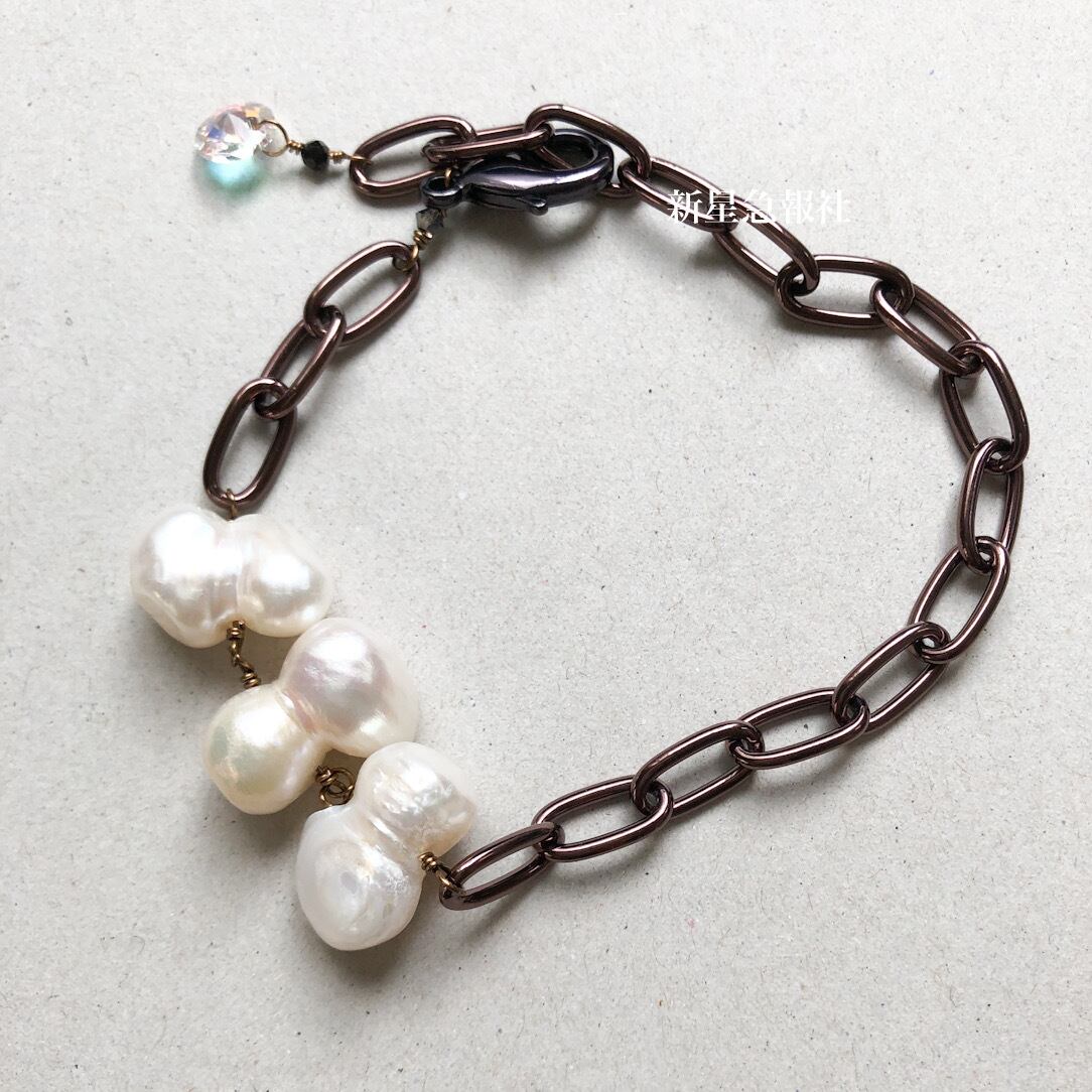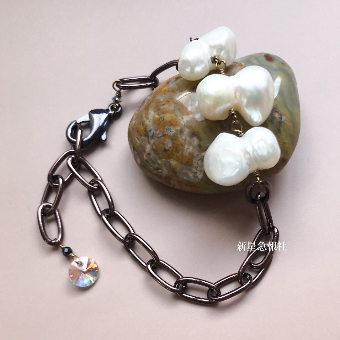 淡水真珠、ガラス(スワロフスキー社製)、黒曜石