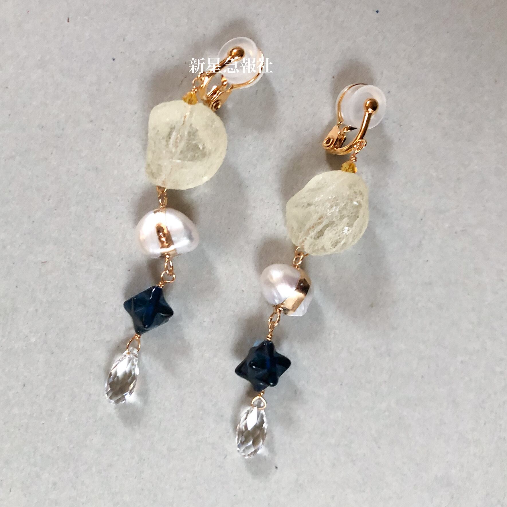 樹脂素材、こはく(染色)、淡水真珠、ガラス(スワロフスキー社製)