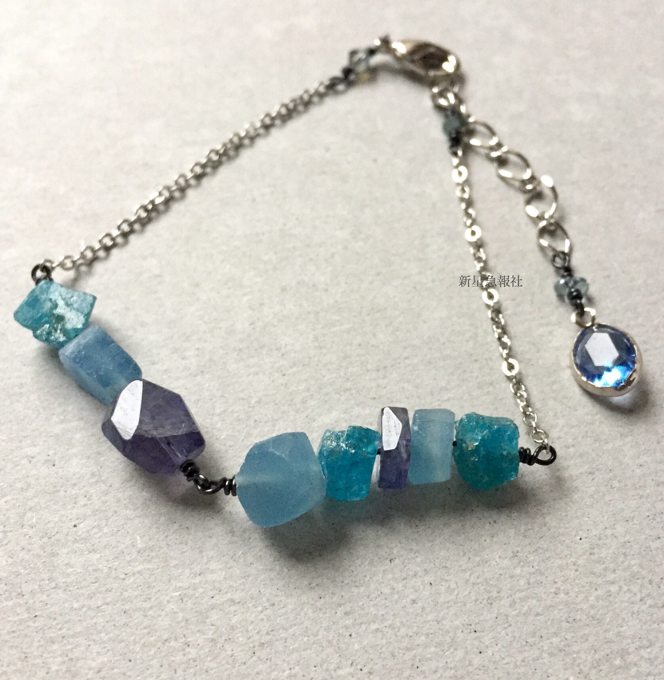 アクセサリーは一部にアパタイト、アイオライト、ブルーカルセドニー、ガラスを含みます。