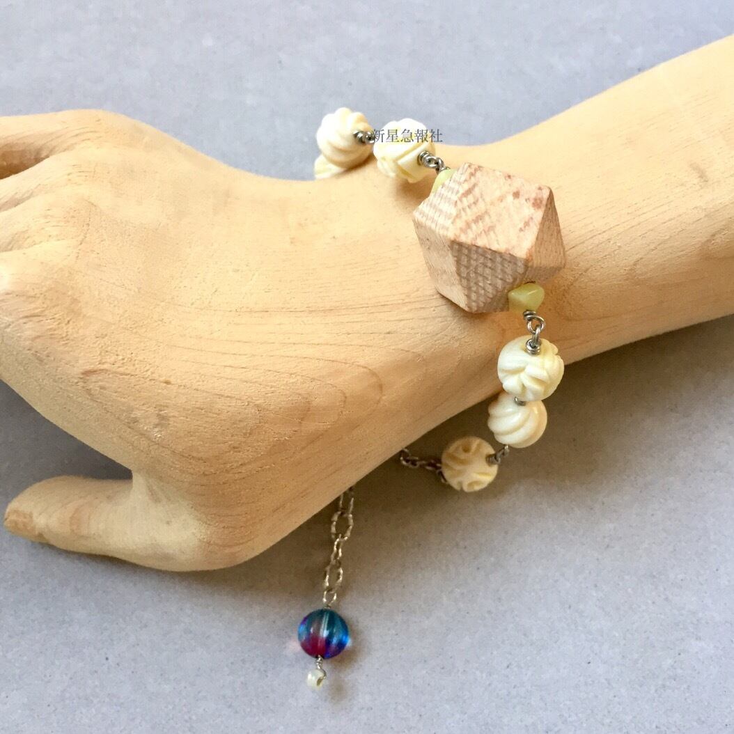 アクセサリーは一部に木、らくだの骨、ラクト樹脂、