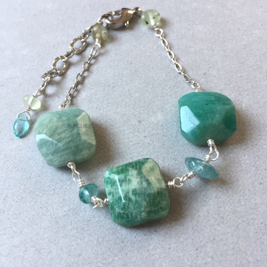 アクセサリーはロシアンアマゾナイト、アパタイト、プレナイトを含みます。