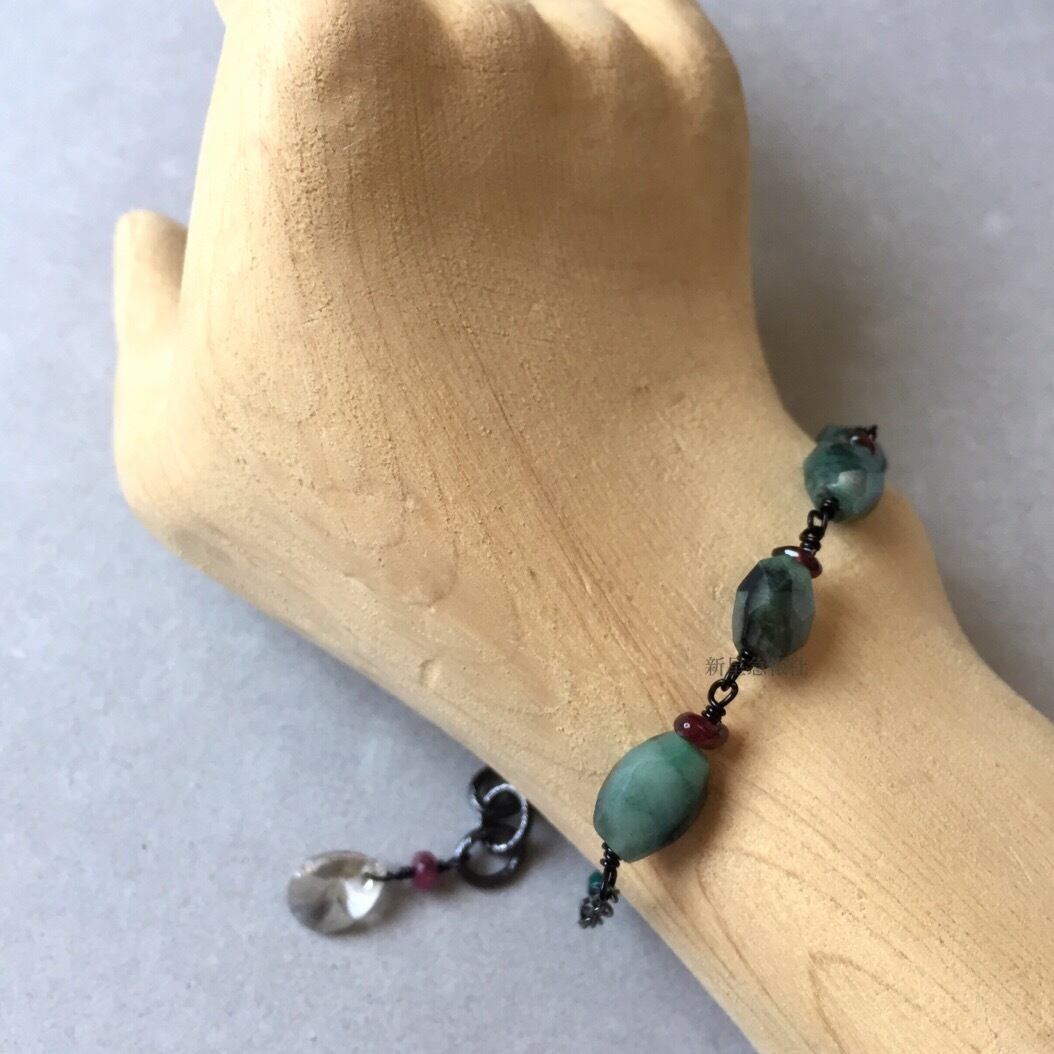 アクセサリーはエメラルド、ガーネット、ルビー、ガラス(一部スワロフスキー、チェコビーズ)を含みます。