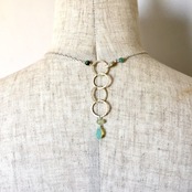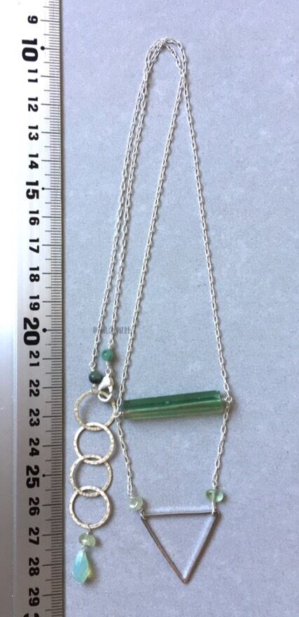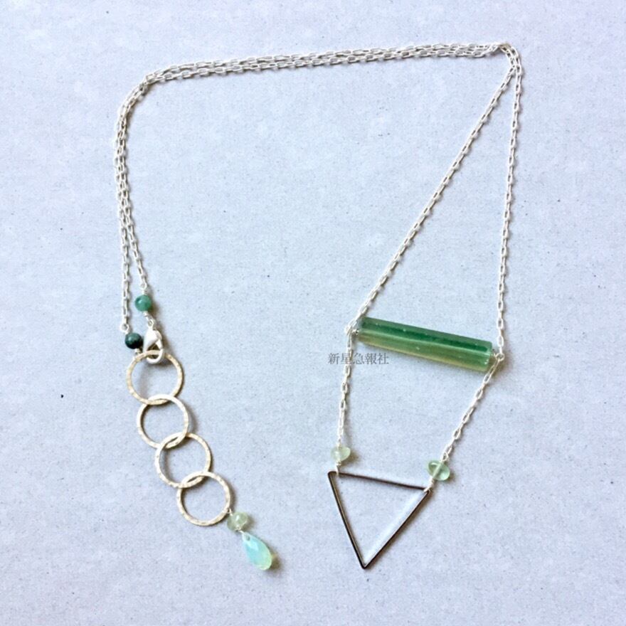 アクセサリーはフローライト、プレナイト、エメラルド、ガラス(スワロフスキー社製)を含みます。