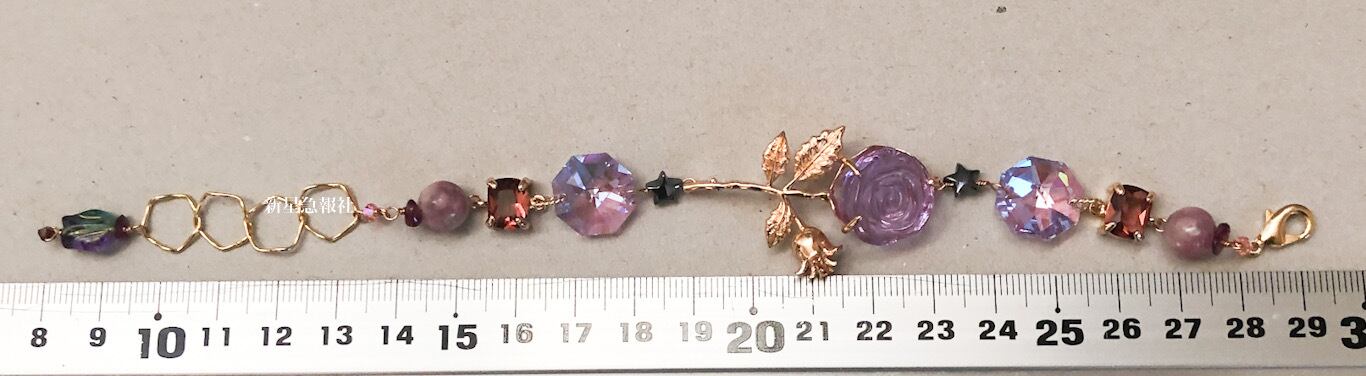 ガラス(一部スワロフスキー社製、チェコ製)、レピドライト、ガーネット、