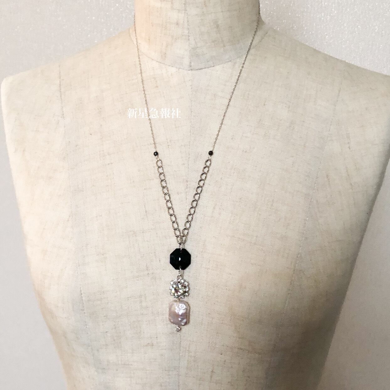 淡水真珠、ガラス(一部スワロフスキー社製、チェコ製)、黒曜石